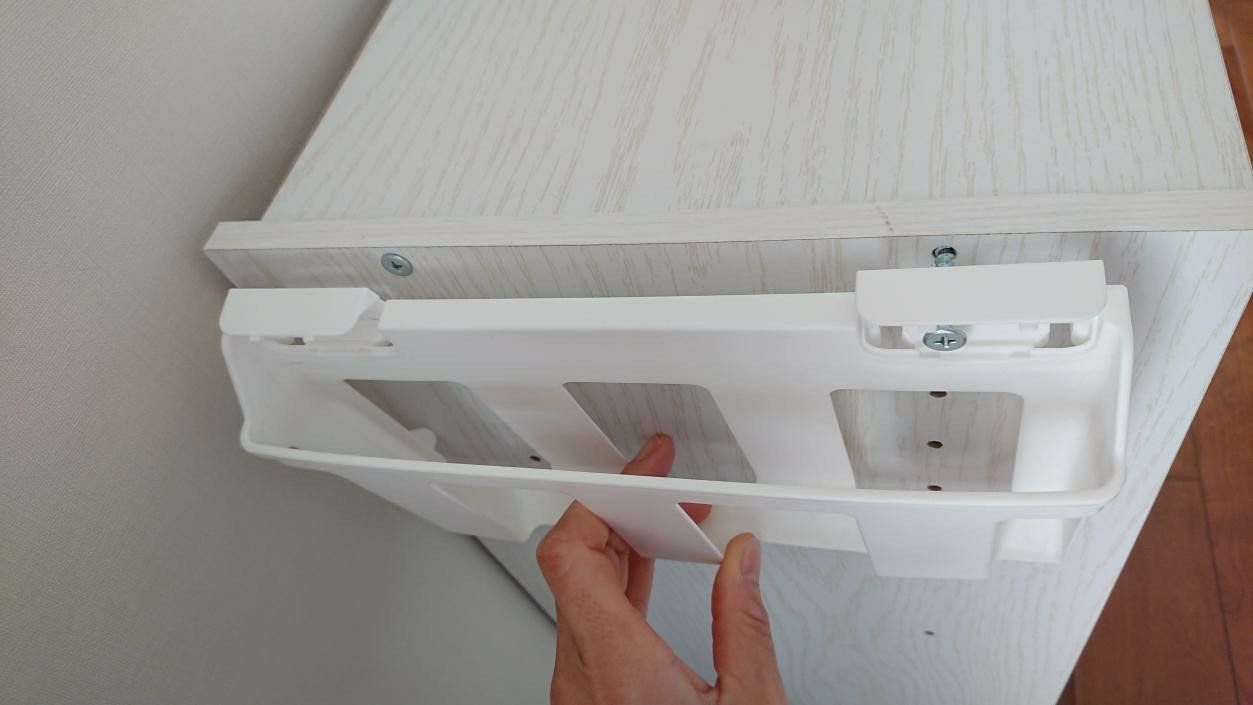 ちなみに、我が家のカラーボックスは棚板の高さを変えられる可動棚タイプ。側面にネジが見えないので取り付け不可能と思いきや、天板はネジが見えているので取り付け可能でした。ただし、すべてのカラーボックスに対応している訳ではないので注意が必要です。