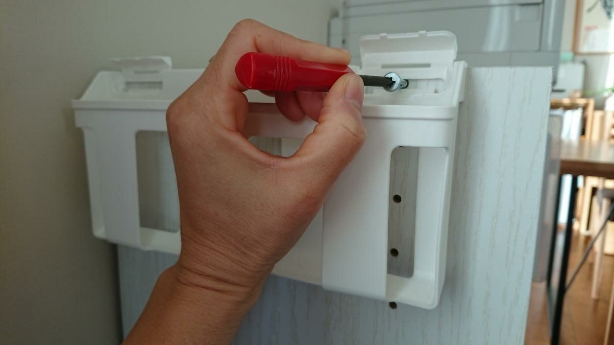 左右のネジを締め終わったら、フタをしめて設置は完了!ネジ穴が隠れるので、見た目がスッキリするのもうれしいですね。通常であれば、商品名のとおり雑誌などを収納して利用しますが、今回は小物をセットする場所として活用するアイデアをご提案!