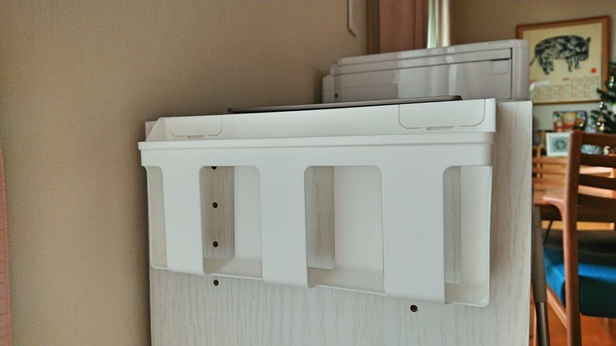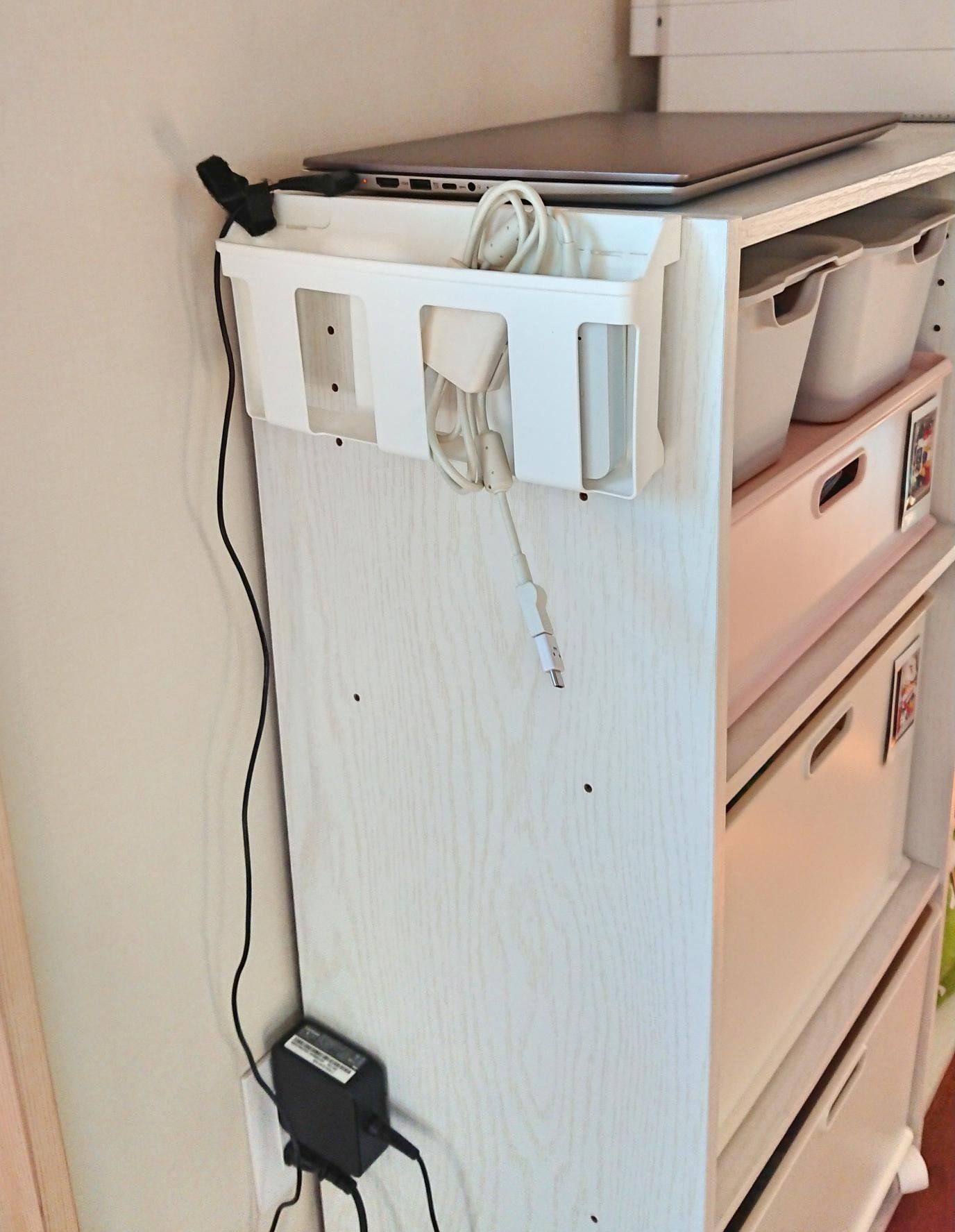 たとえば、充電ステーションとして活用してみるのはいかがでしょうか。我が家のパソコンはカラボの上が定位置です。ここでのPC作業はもちろん、充電器がこのラックに収納できるので楽ちんです。