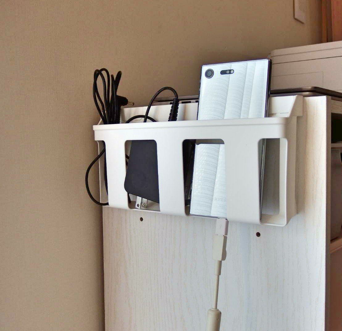 スマホの充電ステーションとして利用するのもおすすめ。本体にスキマがあるので、写真のようにスマホをラックにおいて、ケーブルを下から通せばごちゃごちゃしにくいですね。