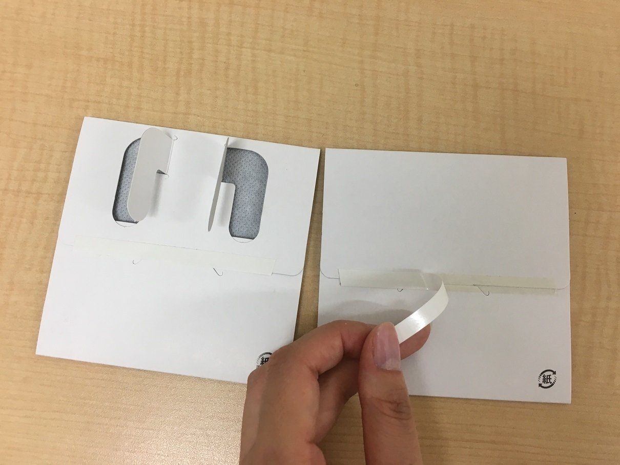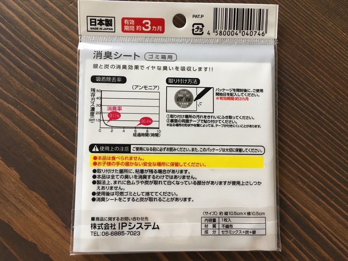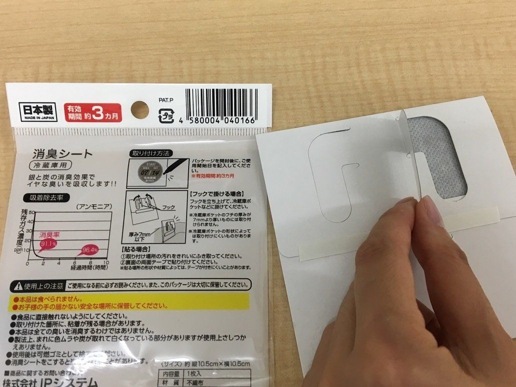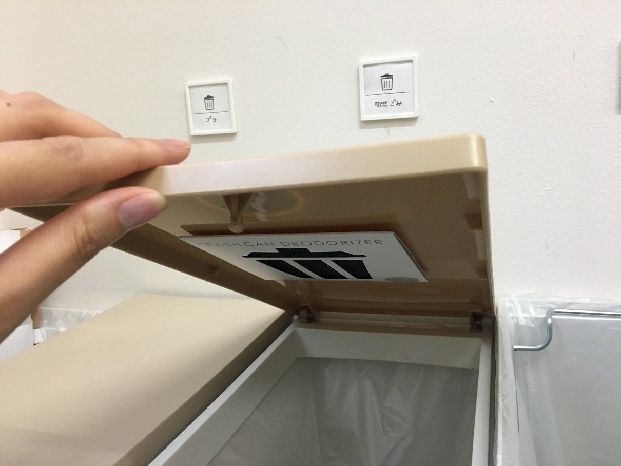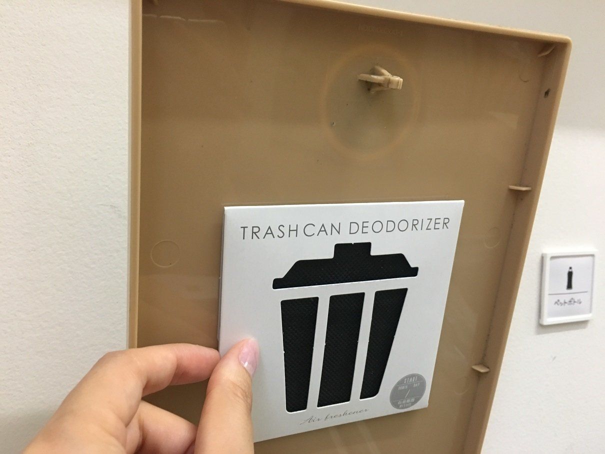 ゴミ箱用はシートの裏面に両面テープがあるので、最初にそれを剥がしましょう。あとはゴミ箱のふたの内側に貼るだけ。3カ月間使用できます。