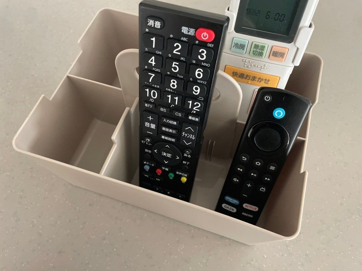 リビングの小物入れとしては、リモコン類もおすすめ。立てて収納することで省スペースかつ、誰もが見つけやすいリモコンの定位置ができますよ。