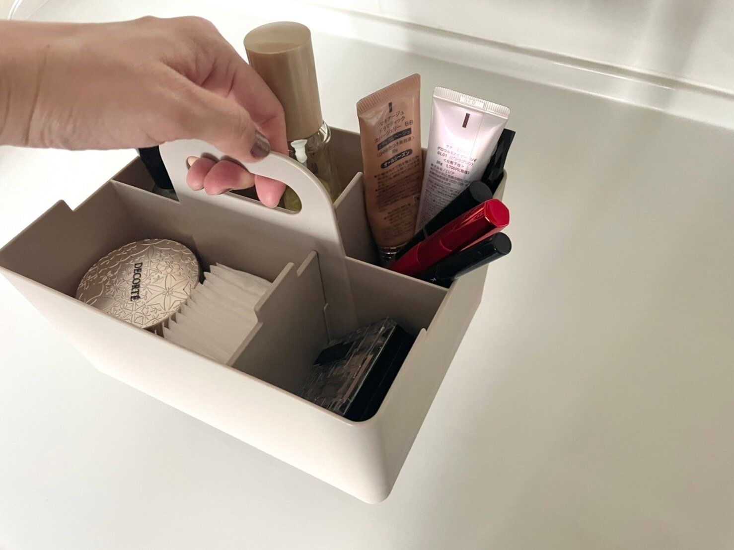 洗面所におく化粧品入れにもおすすめです。ペンやチューブ類もしっかりスタンドするので取り出しやすいです。また、その時々によってお化粧をする場所が変わる方は、そのままリビングや居室に持って行くことも可能なので便利ですよ。