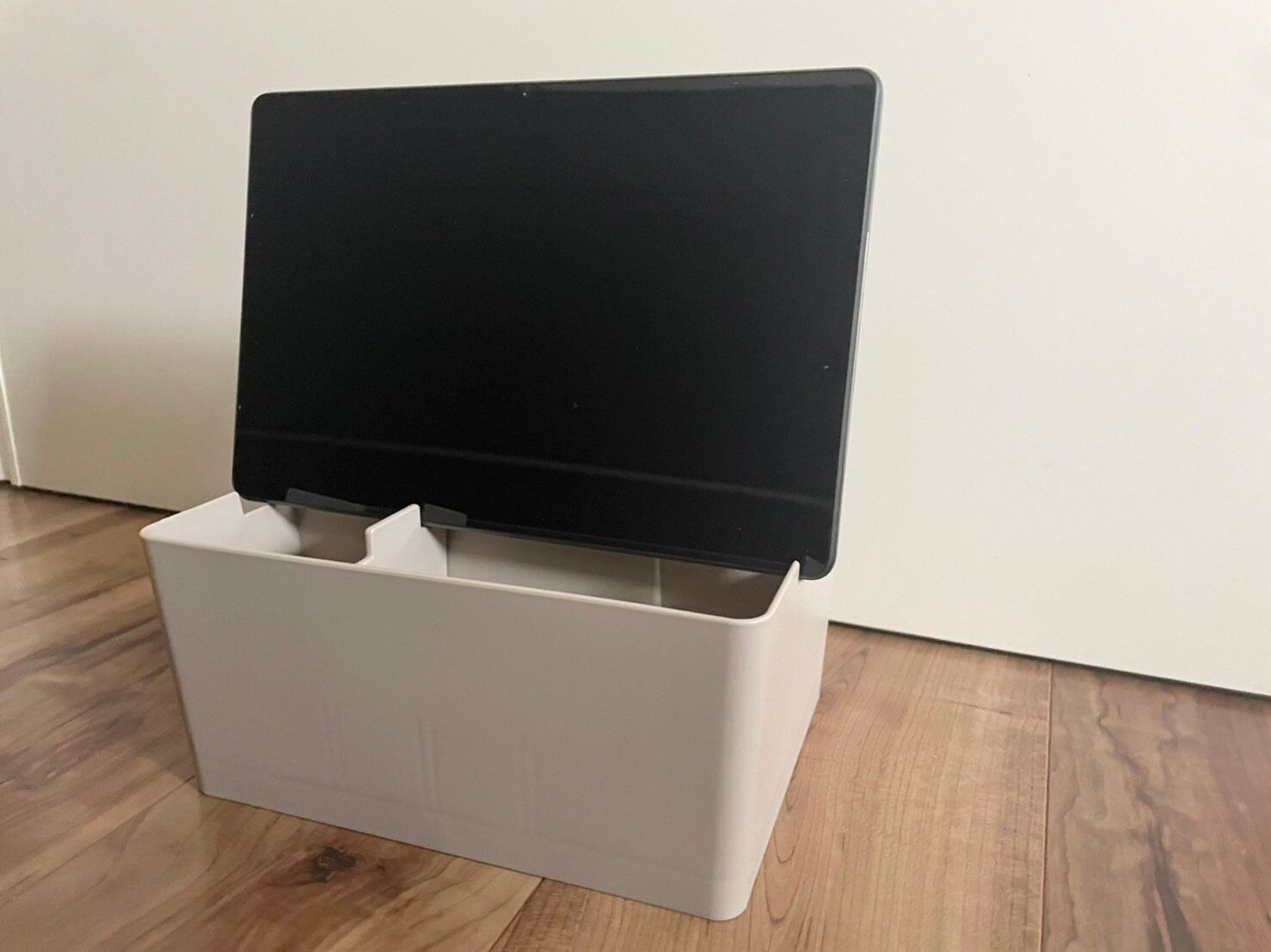他にもこんな使い方ができます。スマートフォンを置いて掛けたり、タブレットを横向きで掛けたりすることが可能です。仕切板の向きを変えると、タブレットの角度を変えられる工夫もされています。動画を見る際など、タブレットを立てた方が首も疲れにくいので便利ですよ。