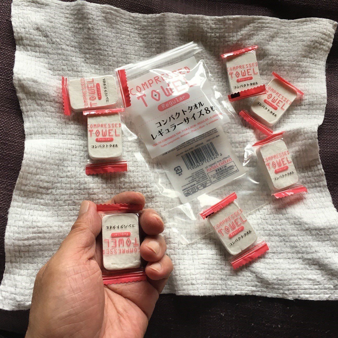 「コンパクトタオル」は、圧縮タイプのタオルで水につけると大きくなります。普段はコンパクトなので、何枚持っていっても少しもジャマになりません。