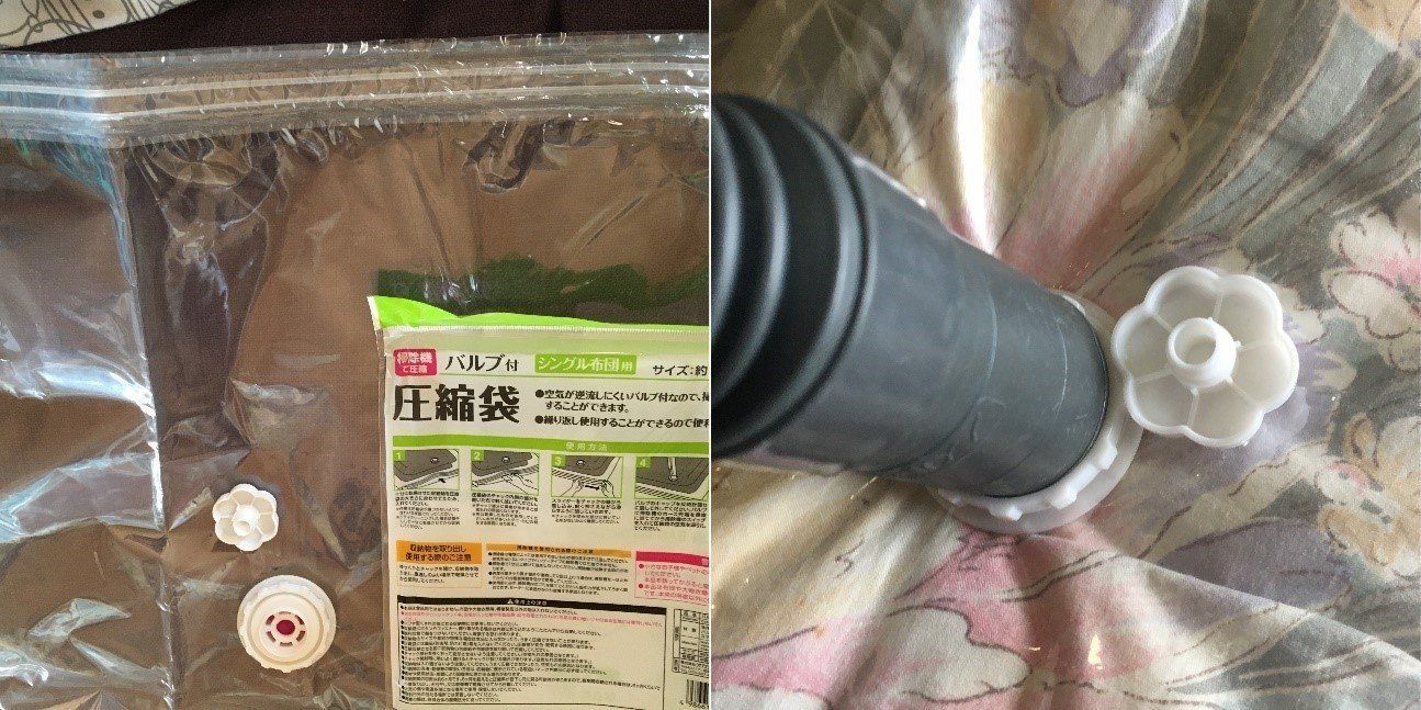 セリアのバルブも、フタを外して掃除機の吸い込み口を充てるタイプ。こちらの商品も簡単に空気を抜くことができました。