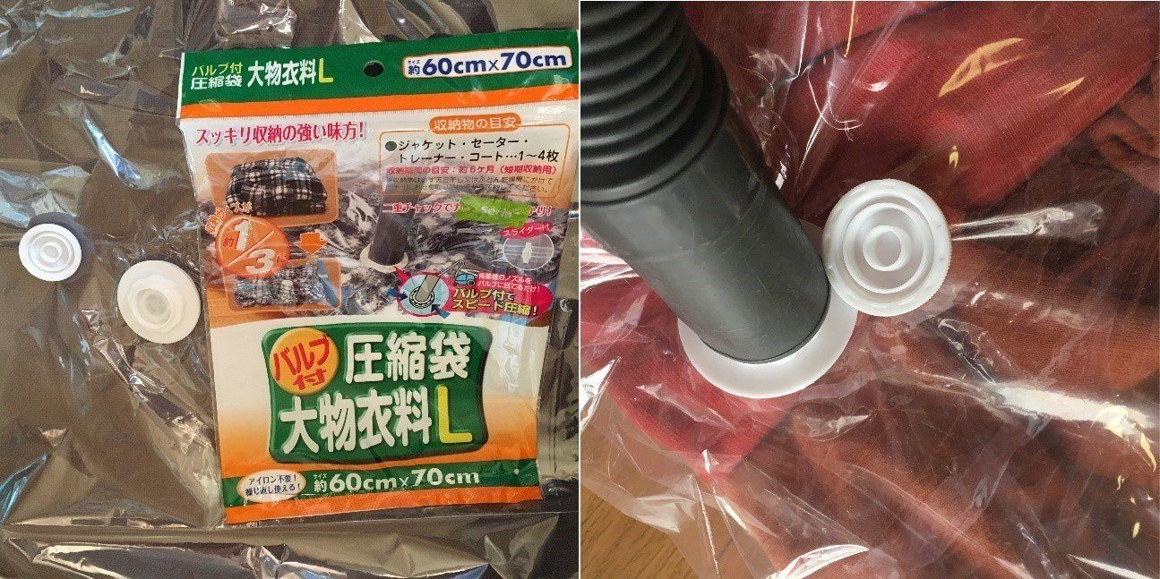 服を小さくして収納するのに最適なものと言えば「圧縮袋」。空気を抜くのが面倒と感じる人もいるかもしれませんが、最近の100均で買える圧縮袋には、空気を抜くためのバルブ付きがほとんど。