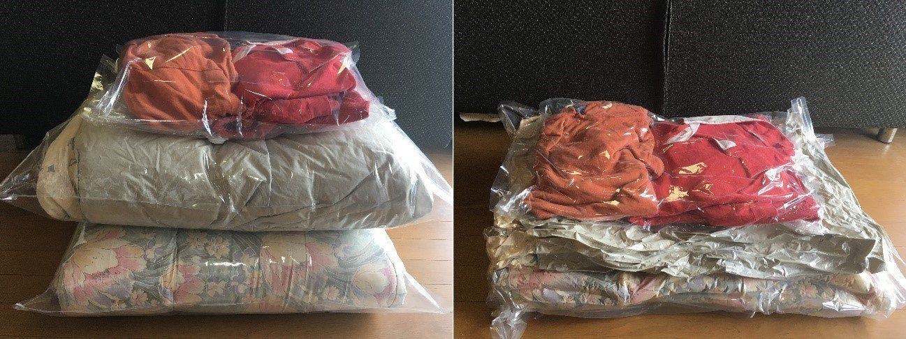 圧縮袋に入れると、衣類や布団のサイズが3分の1程度になるので、収納場所はとても少なくてすみます。布団なんて、まるで板みたいにカチンコチンになってしまってビックリです。