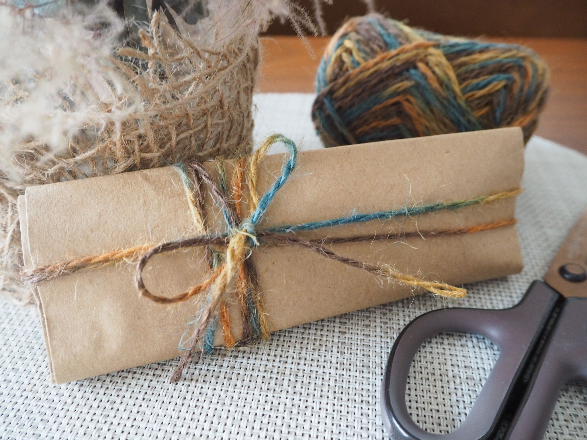 ラッピング以外にもおもてなしでカトラリーに巻きつけたりしても可愛いので好みの毛糸を発見したときは1玉買っておくと便利ですよ!