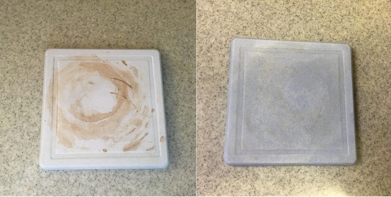 上の写真は、以前から使っていたダイソーの珪藻土コースター。写真左はコーヒーの汚れがついて汚くなってきた状態で、写真右は紙やすりで削ってキレイにしたもの。吸水性が復活し、見た目も良くなるので、メンテナンスはこまめにやっておきたいところ。ちなみに紙やすりは100均でも売っているので、一緒に買っておきましょう。