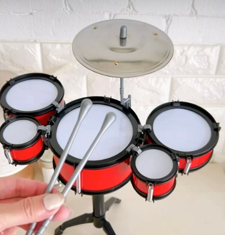 タンバリンのような手で持てるような打楽器は前から販売されていましたが、とうとう「ドラムセット」まで登場しました!値段は550円ですが、それでもだいぶ安い!こんな値段でドラムセットが購入できるようになったなんて、信じられませんね。色も、黒と赤があるのがいいですね。