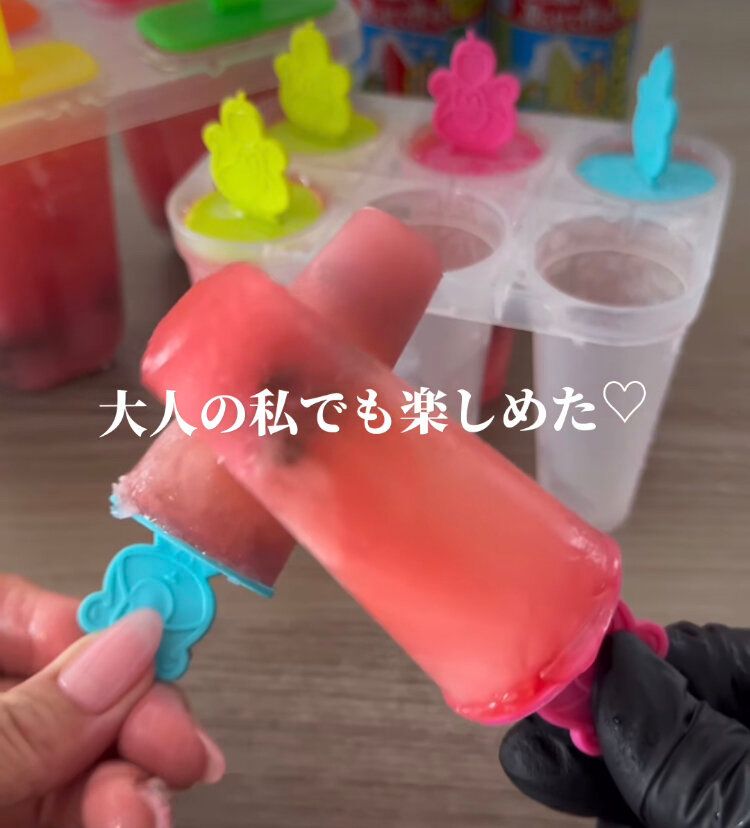 あと「アイスキャンディーメーカー」(110円)を購入すれば、アイスキャンディーメーカーに水を加えた「スイカバーの素」(108円)を入れて冷蔵で冷やすだけ!とっても簡単ですね。注意点としては、こちらの素には種のチョコや皮の部分がないこと。好みに応じて粒状のチョコや、「メロンバーの素」(108円)も一緒に購入して、本物そっくりにしてみてくださいね。