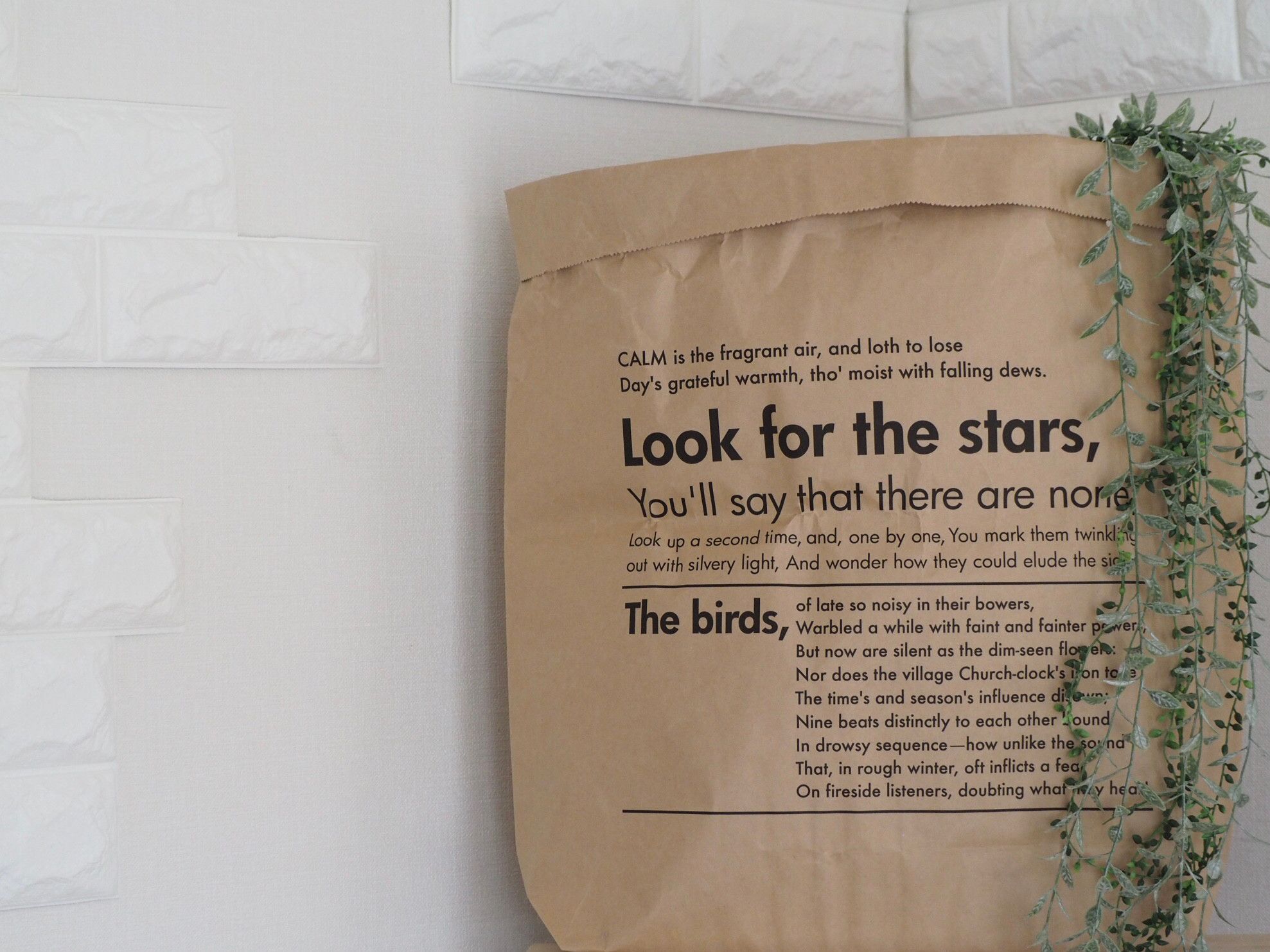 キャンドゥの「ペーパーストックバック(L)」は大きさもあるのでフェイクグリーンを垂らしてあげるだけで存在感大!上側を折り曲げるとしっかりと自立して立ってくれます。「ペーパーストックバック(L)」100円(税別)