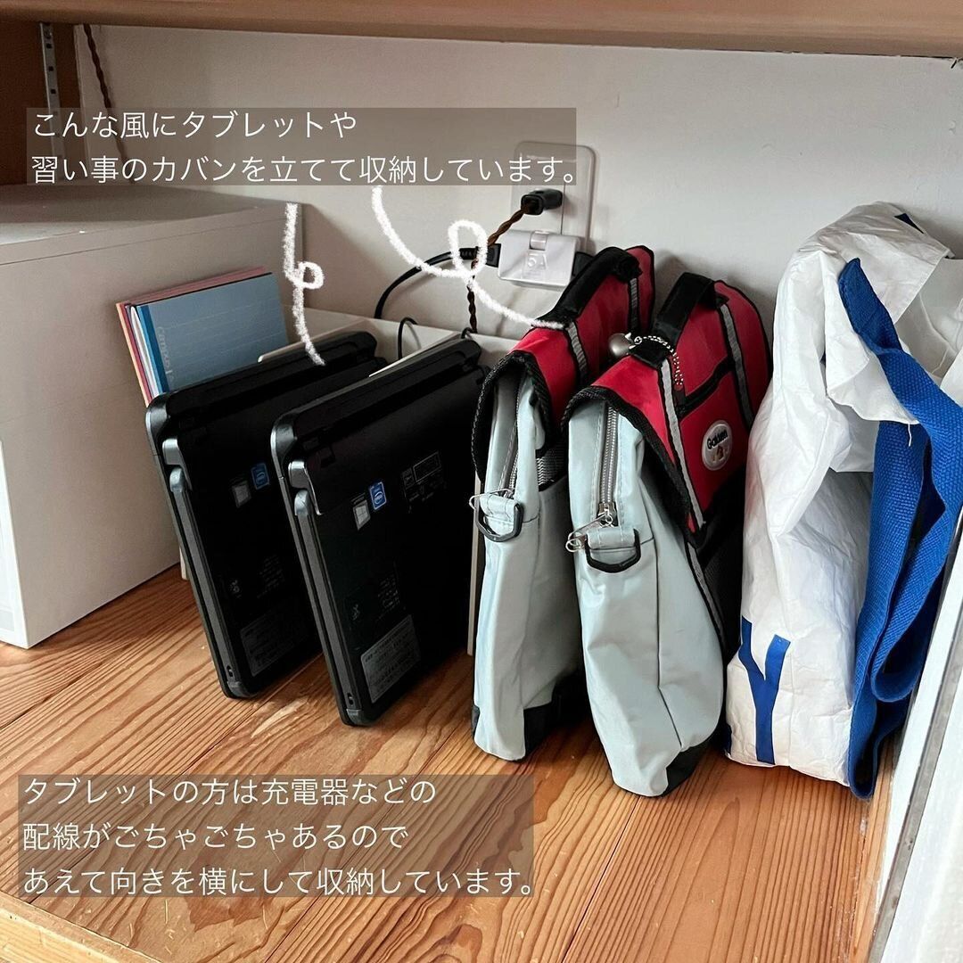 お子さんがいる家庭なら、タブレットや習い事の鞄収納に悩まされることもあるのではないでしょうか?そんなときにおすすめの収納方法が、無印良品の「スチロール仕切りスタンド・ホワイトグレー」(990円)と、「アクリル仕切りスタンド」(1,490円)を使用する方法。