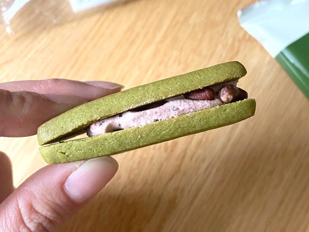 クッキー生地はサクサクとしっとりの間のような、少し変わった食感でおもしろいです。噛むたびに抹茶の香りがひろがり、ほんのりほろ苦さも感じます。まろやかなクリームとクッキー生地もよく合っていて、乾燥小豆のゴリゴリとした堅めの食感が全体のアクセントに。抹茶と小豆の味のバランスもよく、上品なお茶菓子という印象です。