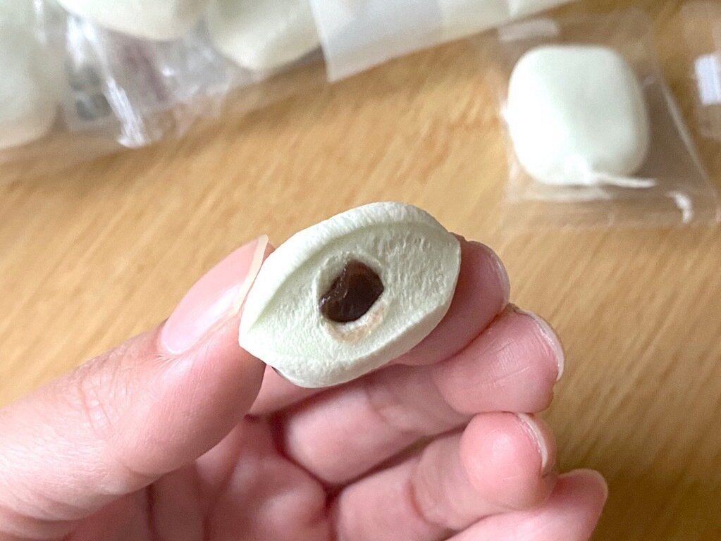 しっとりふわふわの生地は、口に入った瞬間に抹茶の爽やかな香りがひろがります。甘さ控えめの生地と上品な甘さの粒あんは相性がよく、さらに抹茶もちの味が重なると贅沢な味わいに。抹茶もちのトロ~っとなめらかな食感が絶妙でクセになります。1個97円ほどで食べられるとは思えない贅沢なトラ焼きです。