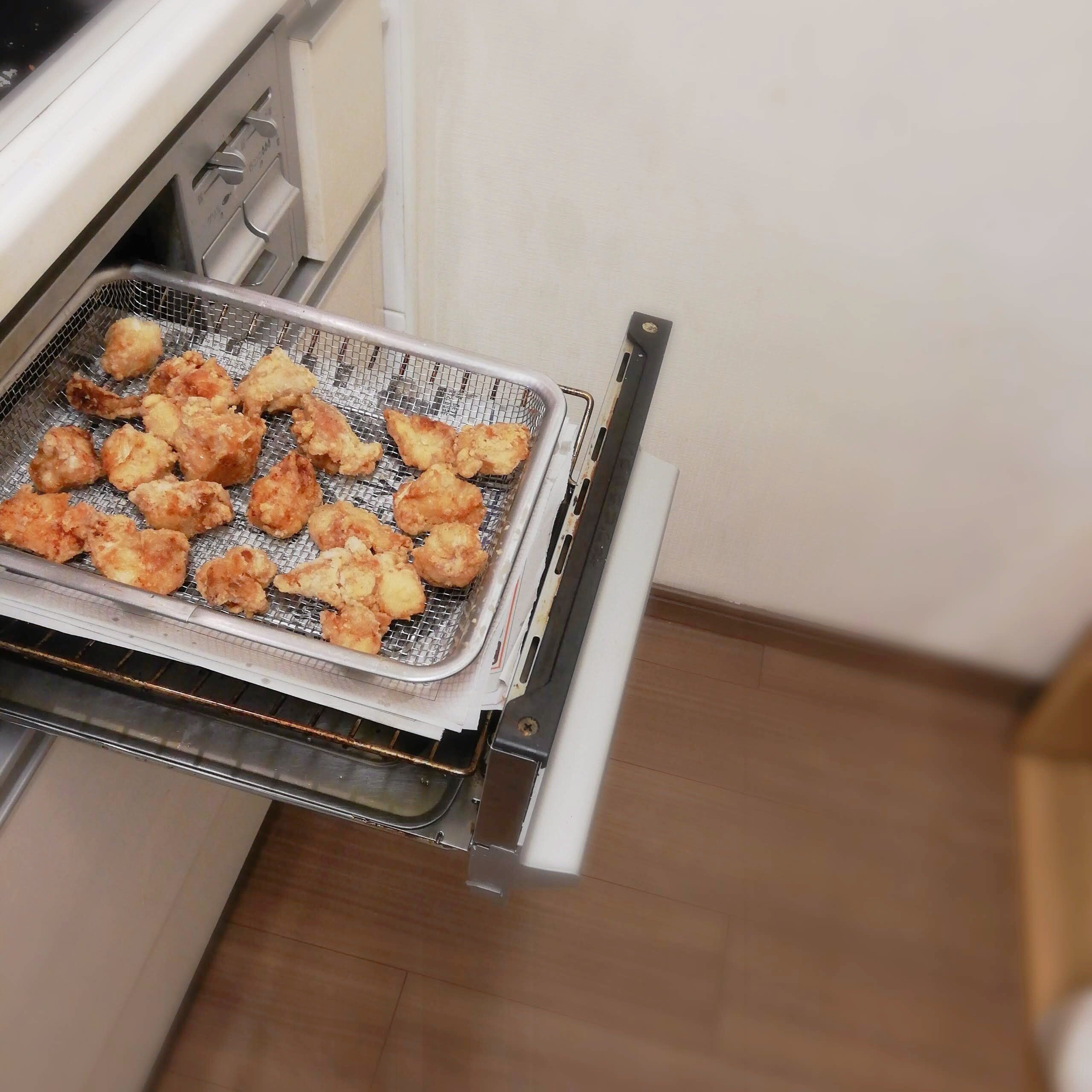 グリル部分に置けるので、下に新聞紙かキッチンペーパーを置くと、揚げ物置き場ができます。