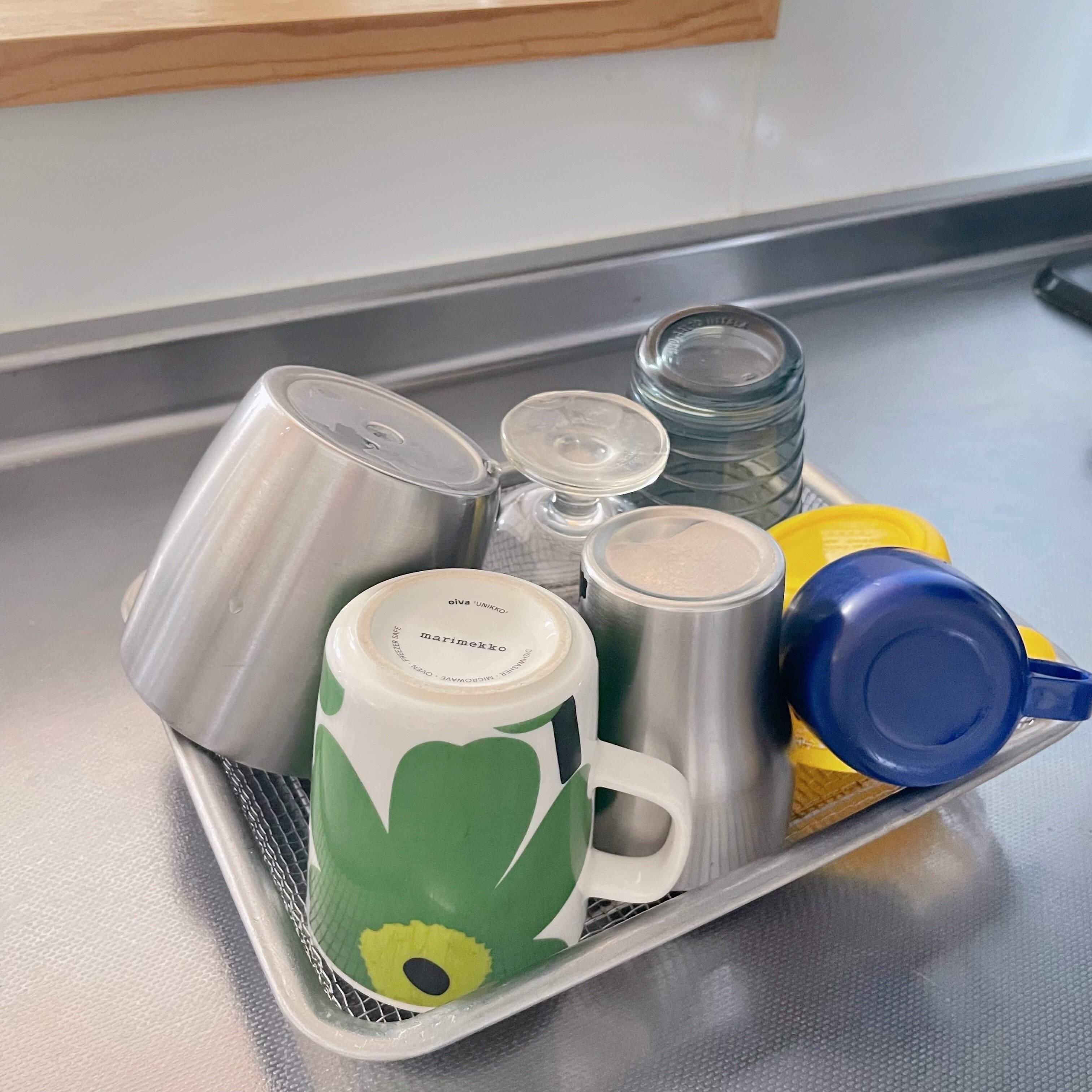 メッシュトレーは、さびに強い18-8ステンレスを使用しているため、コップやカトラリーなどちょっとした水切りカゴ代わりとしても使えます。