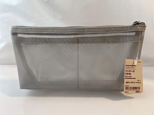 今回ご紹介するのは、無印良品で販売されている「ペンケース マチ付き」です。価格は490円で、カラーバリエーションはグレーと黒の2色。サイズは約幅17×高さ10×マチ5cmで、ナイロンメッシュ素材となっています。