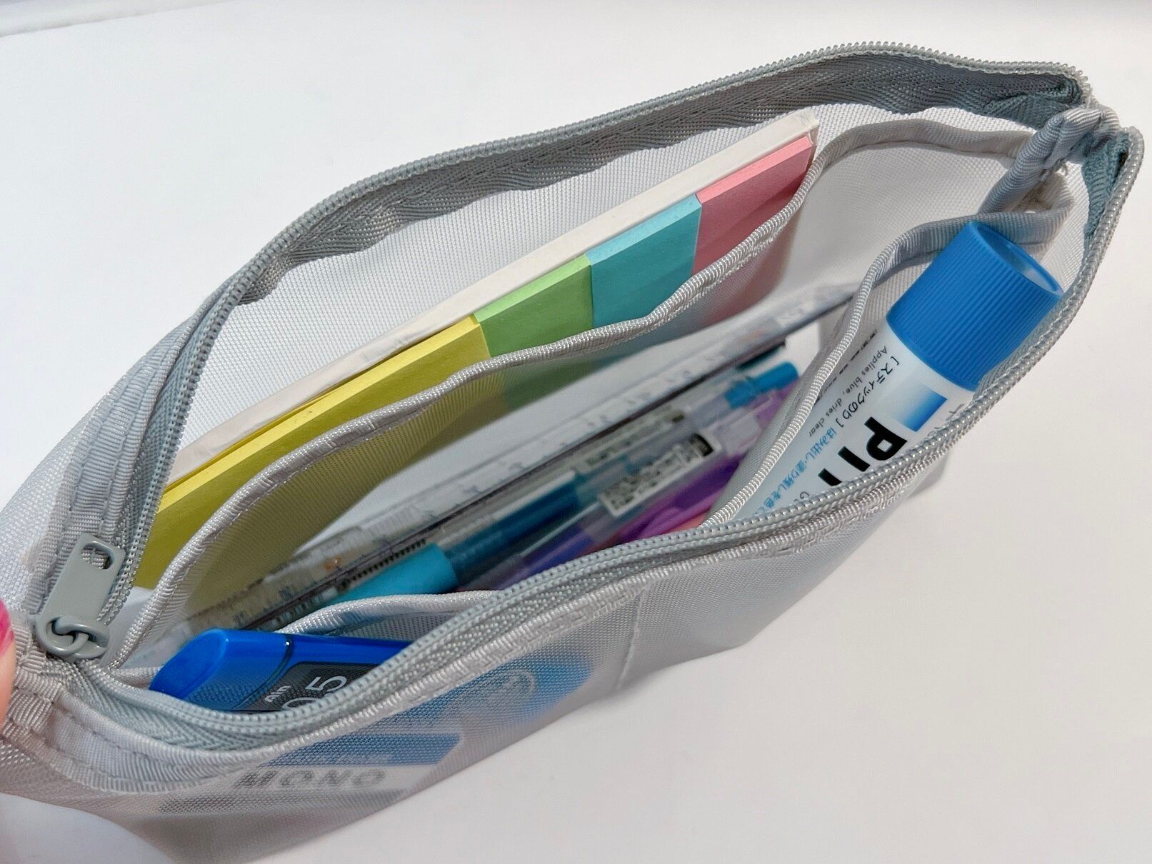 シャーペンやカラーペンなどの筆記具、のり・ハサミ・ホッチキスなどの事務用品までたっぷり収納できちゃいます。内ポケットは付箋紙や消しゴムなど小物収納として使うとペンケースの中がごちゃつきません。