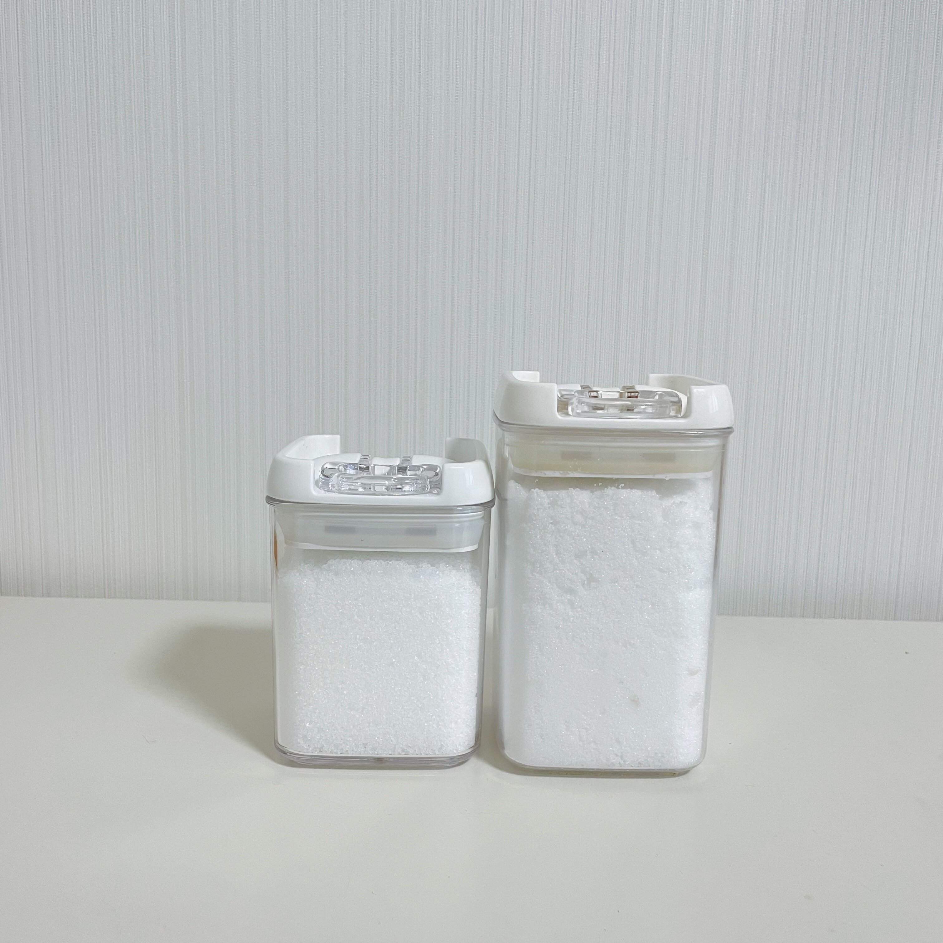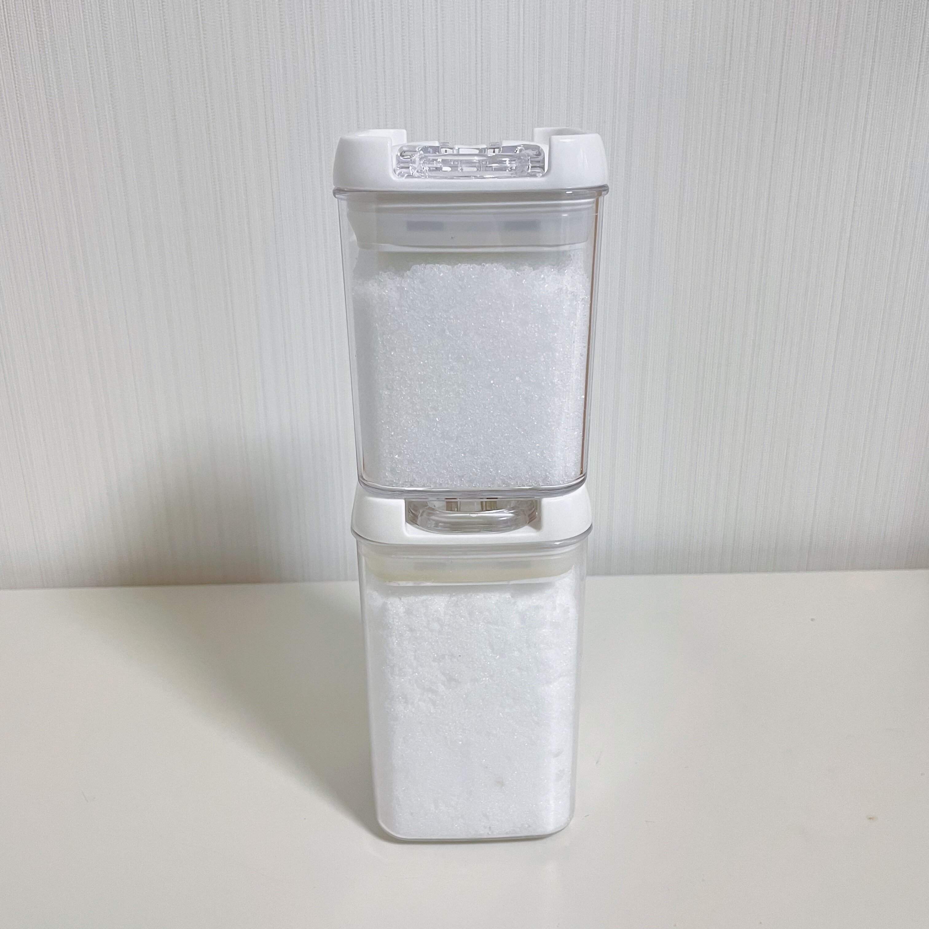 以前は100均の瓶で保存していましたが、今回の砂糖と塩収納においては、ニトリのEasyレバーキャニスターが優秀でした。「収納場所」や「塩が固まる問題」も解決してくれ、プチストレスが改善されること間違いなしです。ぜひ店頭でチェックしてみてくださいね。