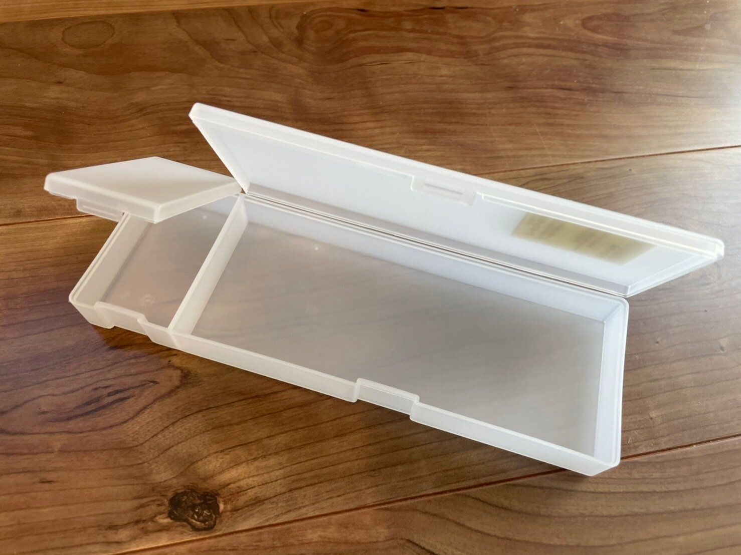 ペンケースのふたと中の収納スペースが、違う大きさで2分割されているところがおすすめポイントです。