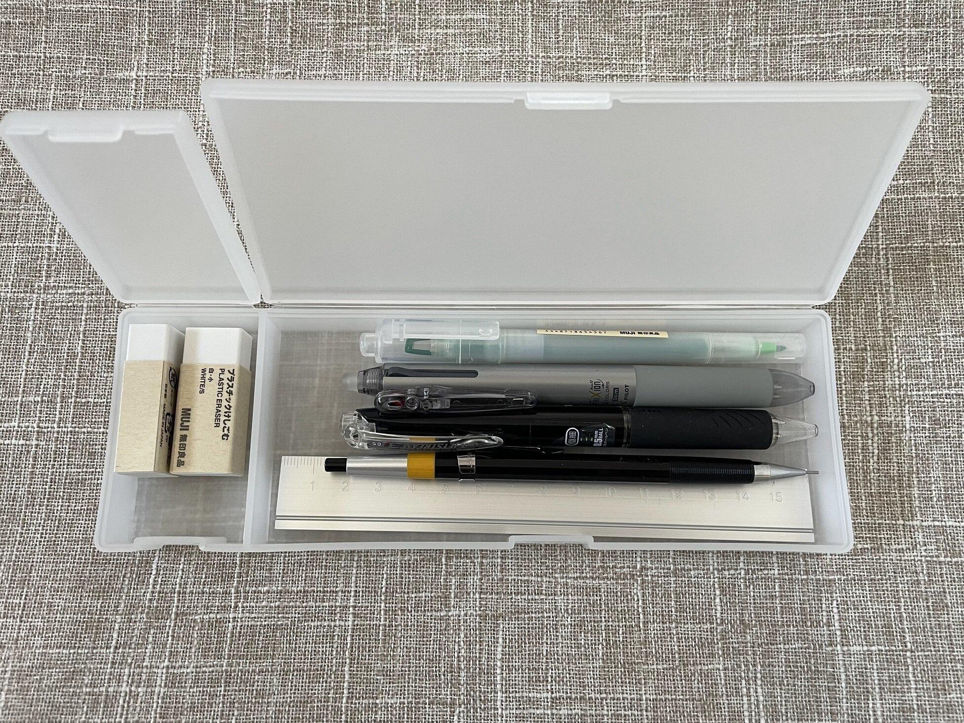 「ペンケース」ですから、写真のとおりシャープペンシル、ペン、消しゴム、定規などが入ります。ものが入りすぎないサイズ感なので、開けたときに取り出しやすいです。よく使う筆記用具を厳選して入れましょう。