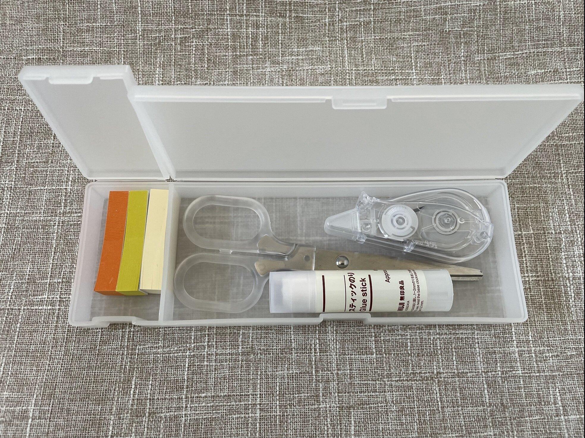 無印良品の「ダブルペンケース」は文房具はもちろん、電池や裁縫グッズ入れなどの細々としたものの収納にも便利。