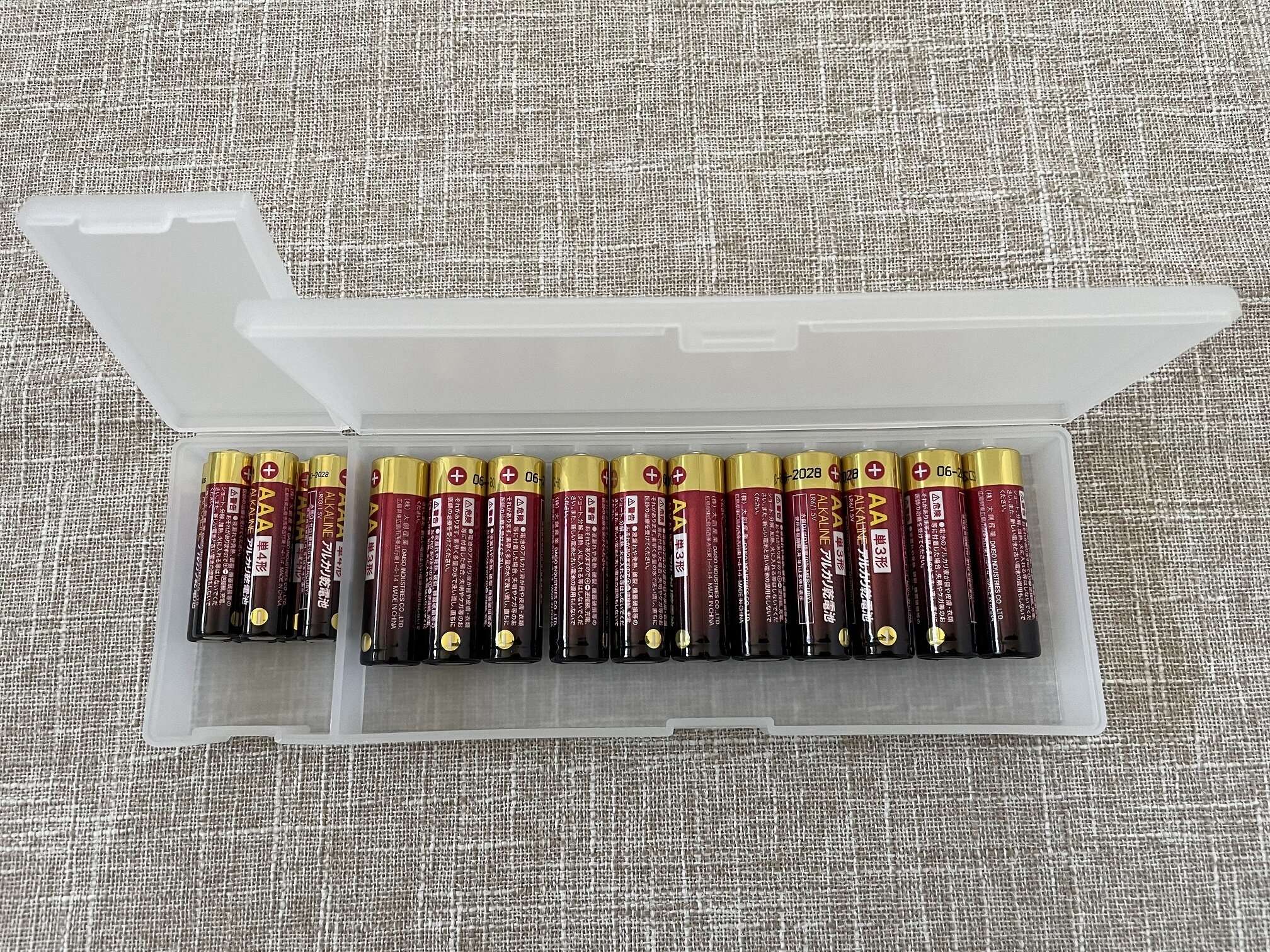 大きいスペースには単3電池が11本、小さいスペースには単4電池が6本程度入ります。電池は収納するときに散らかりやすいので、こうやってサイズ別に整理して収納できるのは便利ですよね。