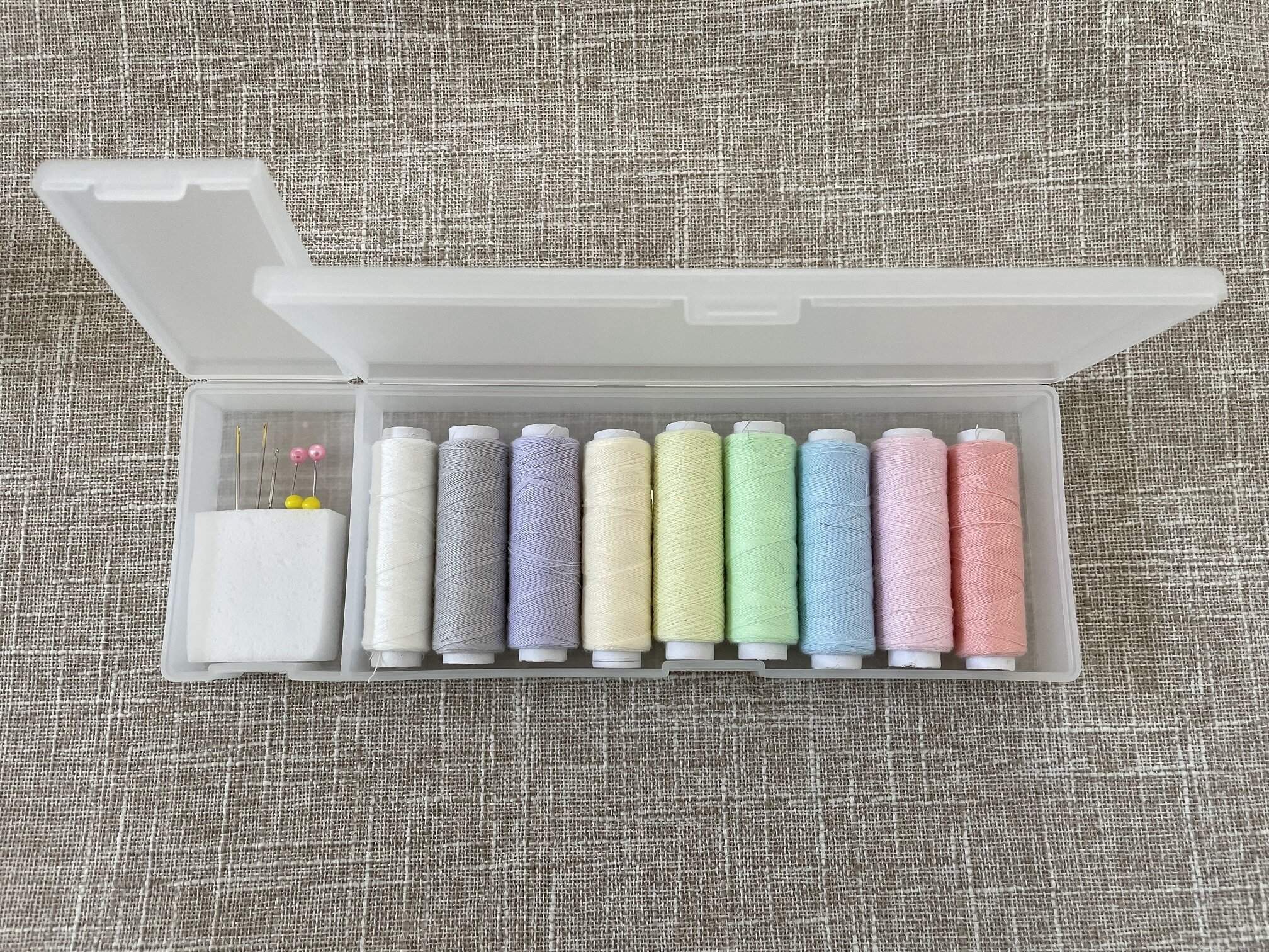 糸や針などの収納もスペースで分けることができます。小さいスペースにはメラミンスポンジをよい大きさにカットし、針を刺して収納しています。