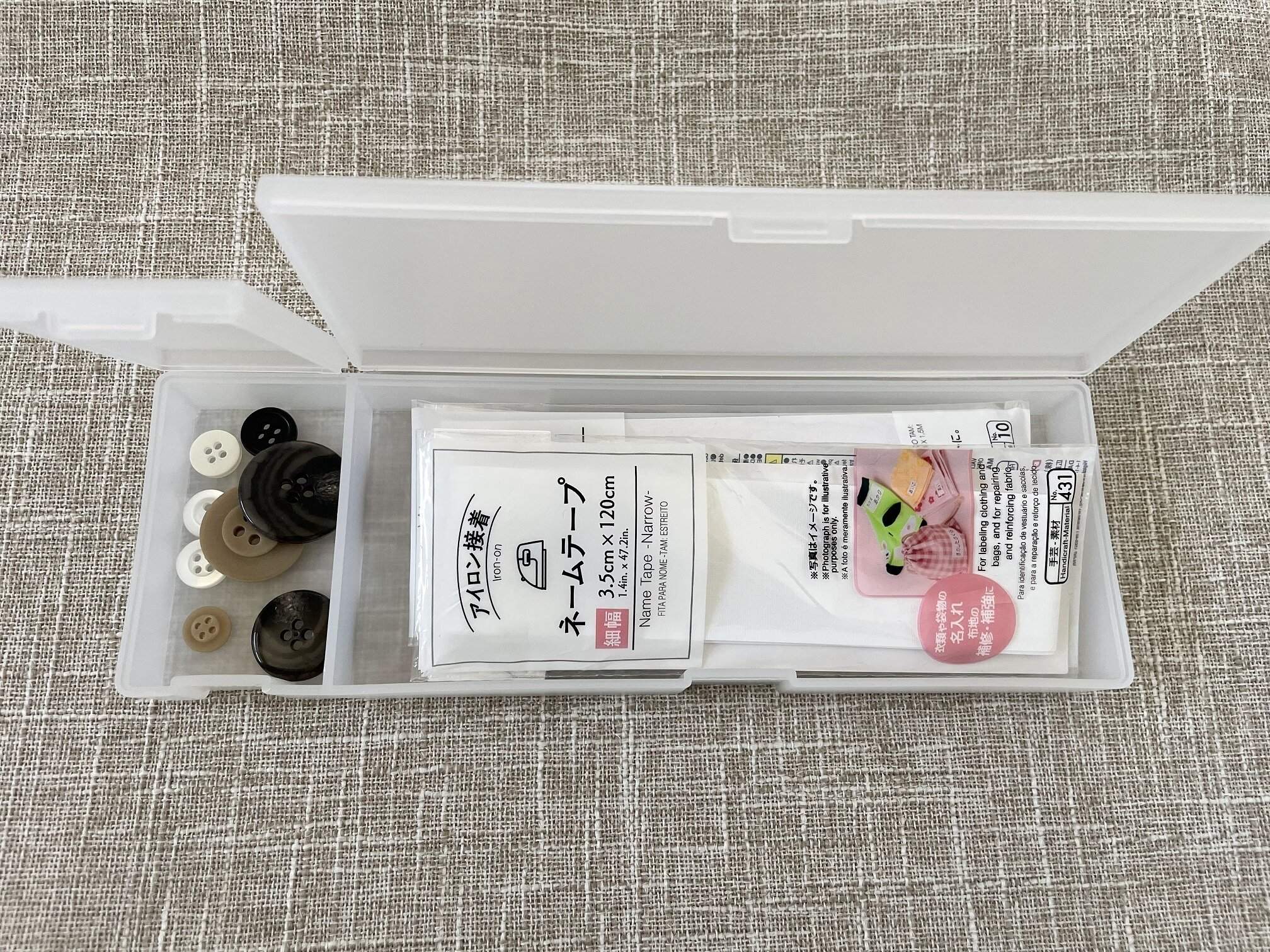 ネームテープや散らかりがちなボタンなどの裁縫グッズを収納するにも、丁度よい大きさの収納グッズです。