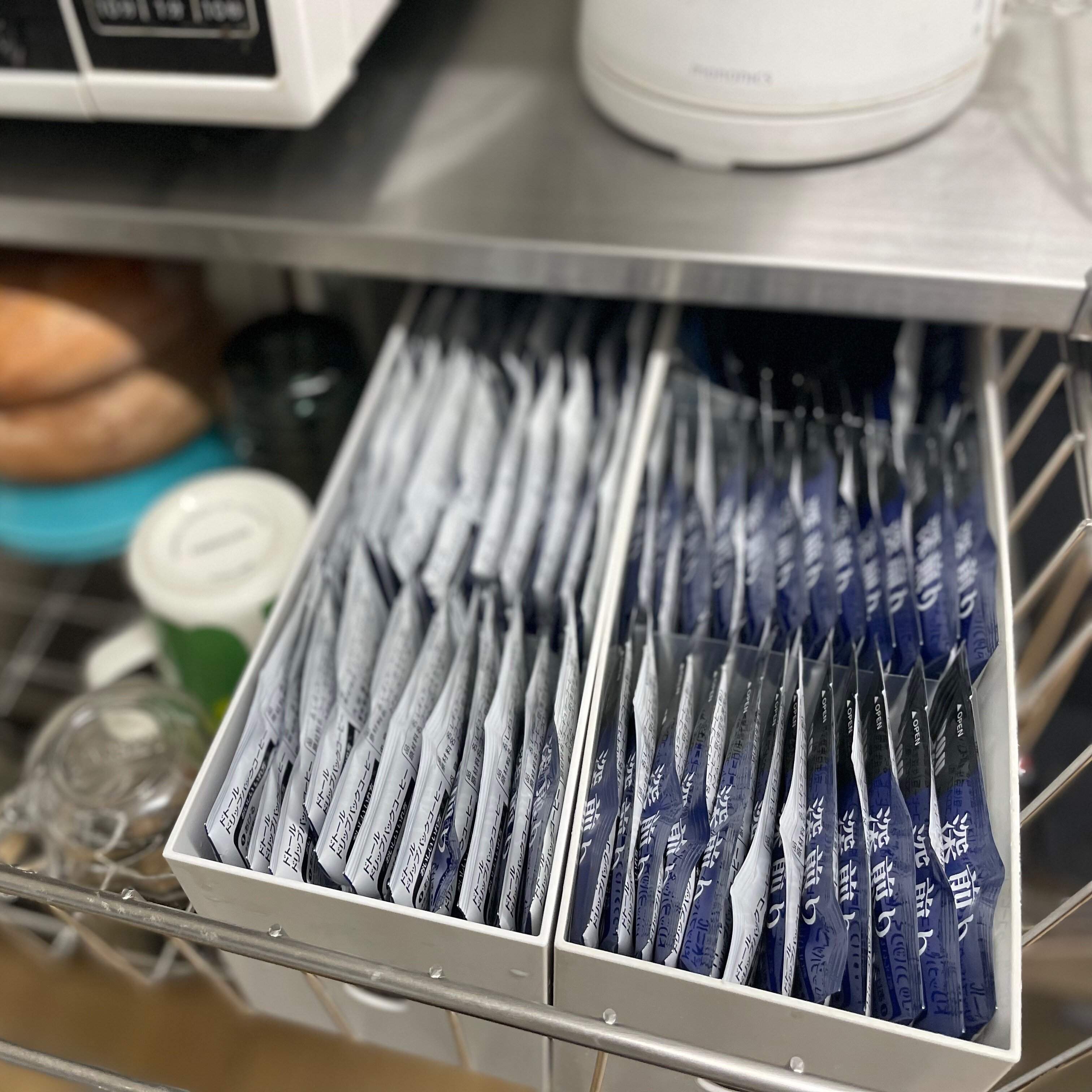 別売りの「ポリプロピレンシート仕切りボックス・3枚組」を使用すれば、ドリップコーヒーがぴったり収まります。