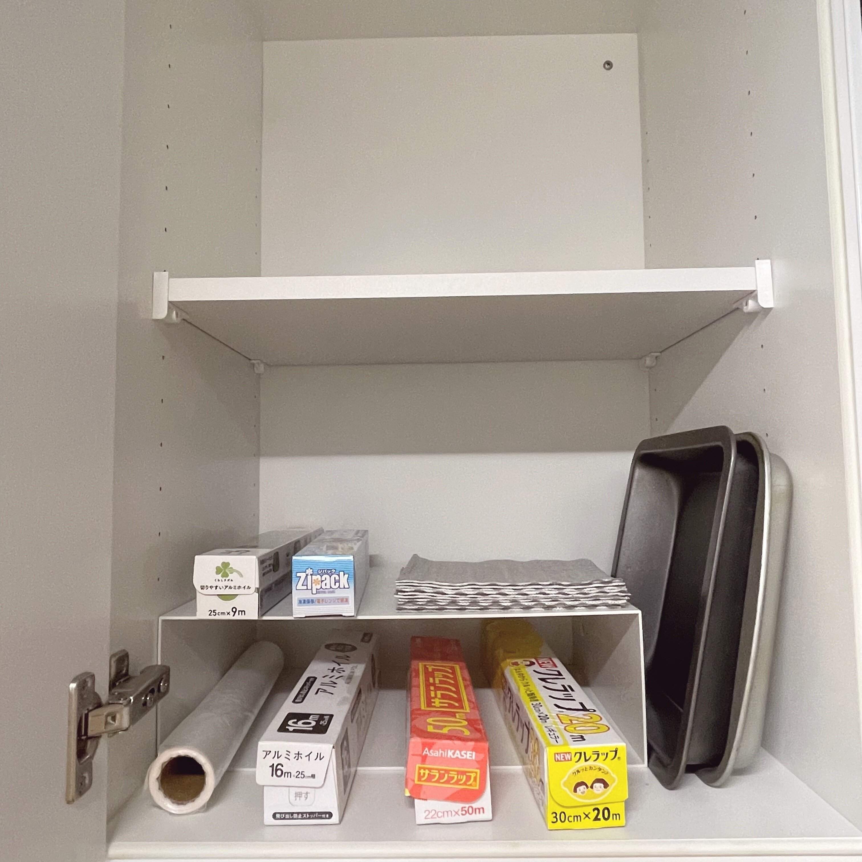 横向きにすることで、収納量も2倍にアップ!布巾やラップ関係のストックなど、軽いものであれば、上に乗せることができます。