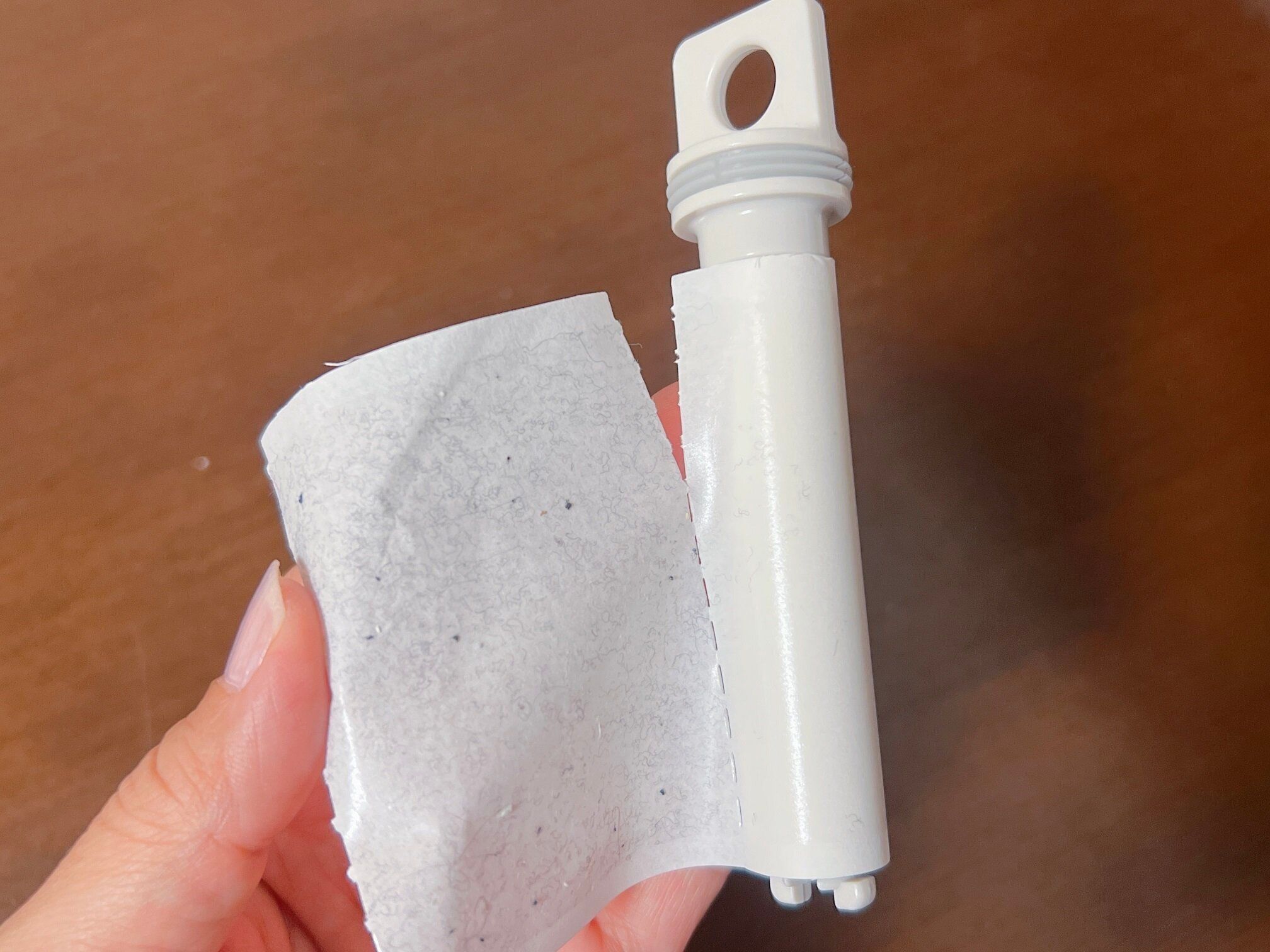 ケースを外すと中にはとても小さなコロコロ(粘着式クリーナー)が出てきます。写真だとわかりづらいかもしれませんが、スティック状の部分が粘着テープになっている仕組み。