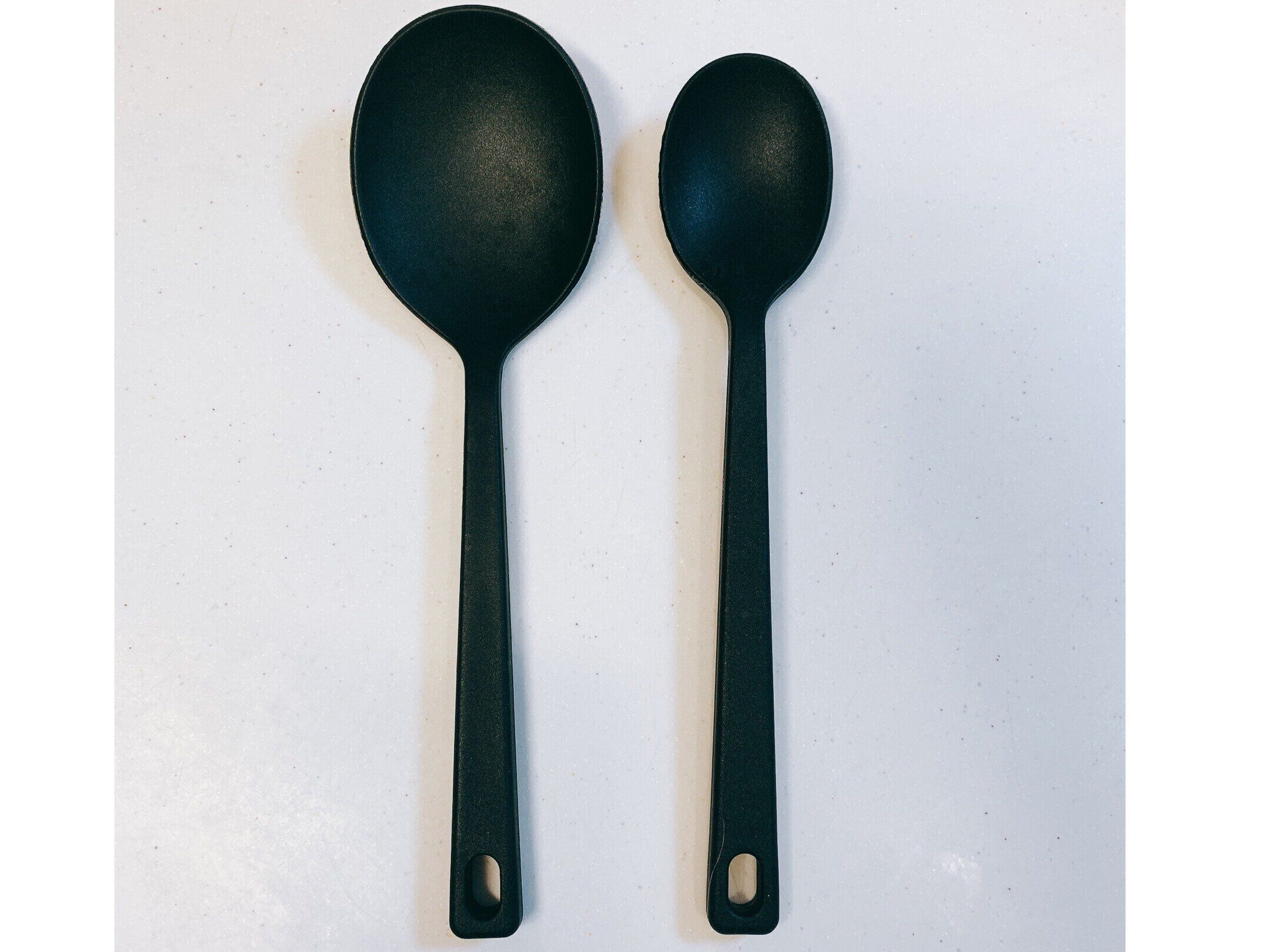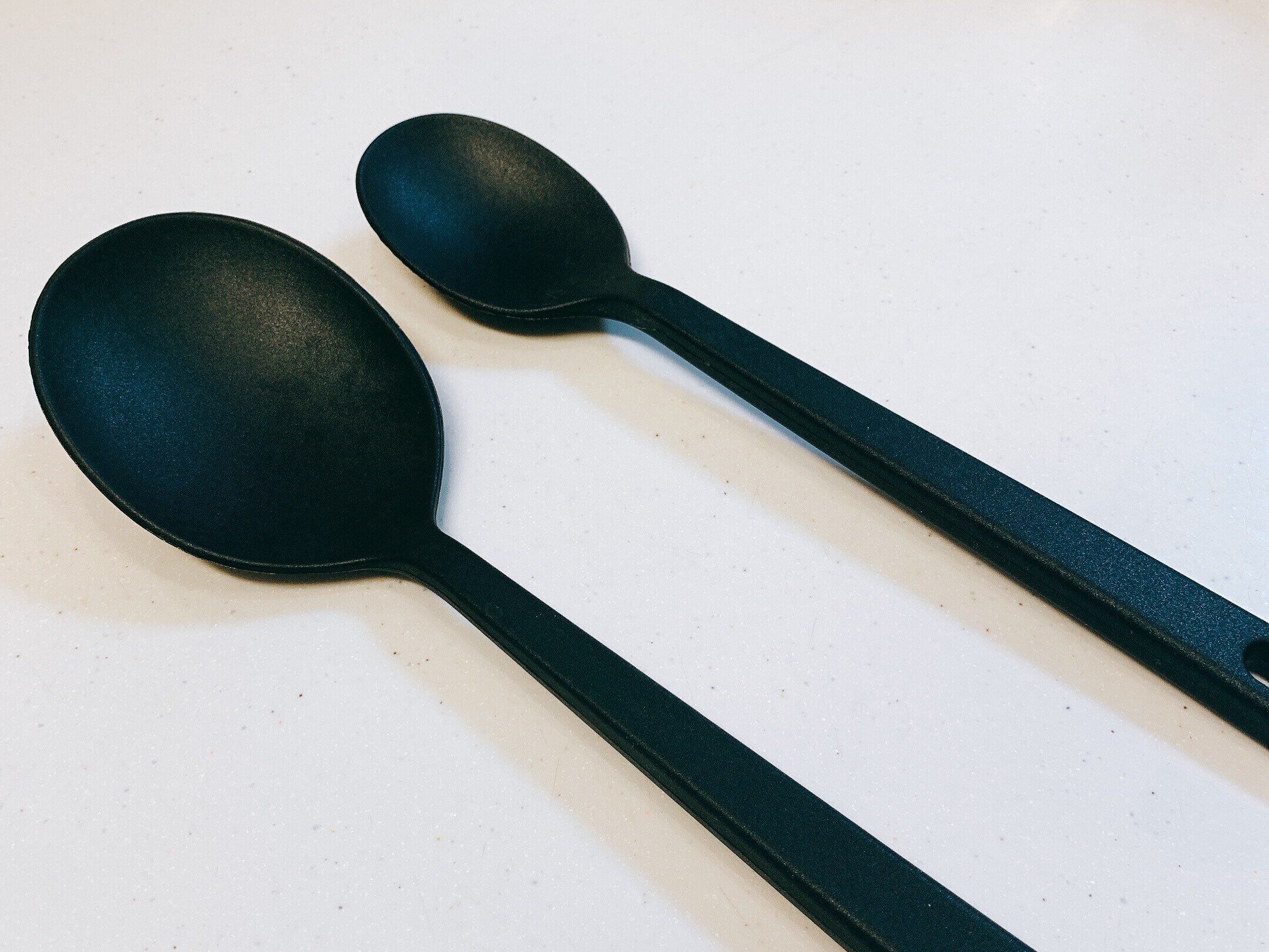 シンプルな黒なので、調理だけでなく、食卓に置き、料理を取り分けるのにも活用できます。普通サイズはスプーンの部分が広いので、お肉料理、魚料理などメイン料理の取り分けに向いています。また、スモールサイズは副菜などの取り分けに便利です。