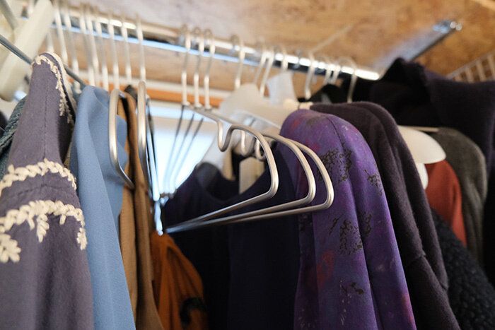 無印良品のほかの種類のハンガーも、私のクローゼットにはいくつかかかっているので、アルミ洗濯用ハンガーにかかっている洋服の薄さが逆にまったくわからない感じになってしまっていますが…こんな感じ。奥の紫のドレスは幅のあるハンガーにかけていますが、手前の青いドレスは、アルミハンガーにかけています。薄っぺらく収納できます。