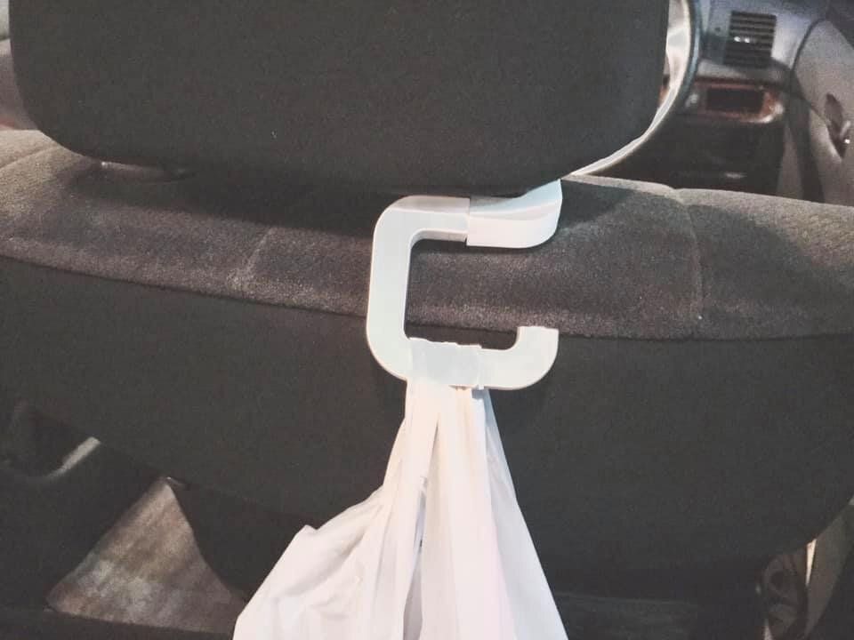車のヘッドレストのバーに取り付けると、スーパーで買った物やバッグを掛けられます。帽子や上着をちょっと引っ掛けるのにも便利ですね。