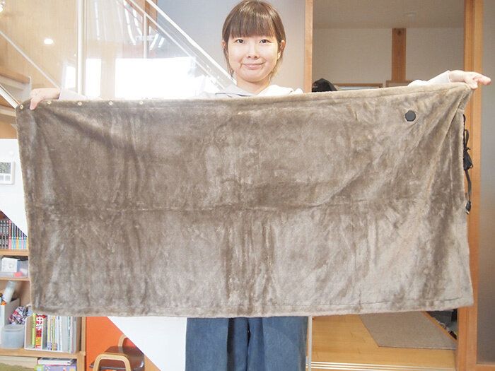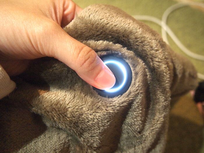 ブランケットにはボタンがついており、肩かけにもできたり、腰巻きにできたりなどかなり便利。上のほうにボタンがついていますが、温度調整はこちらのボタンで行います。右端にコードが見えると思いますが、こちらがUSBコード。