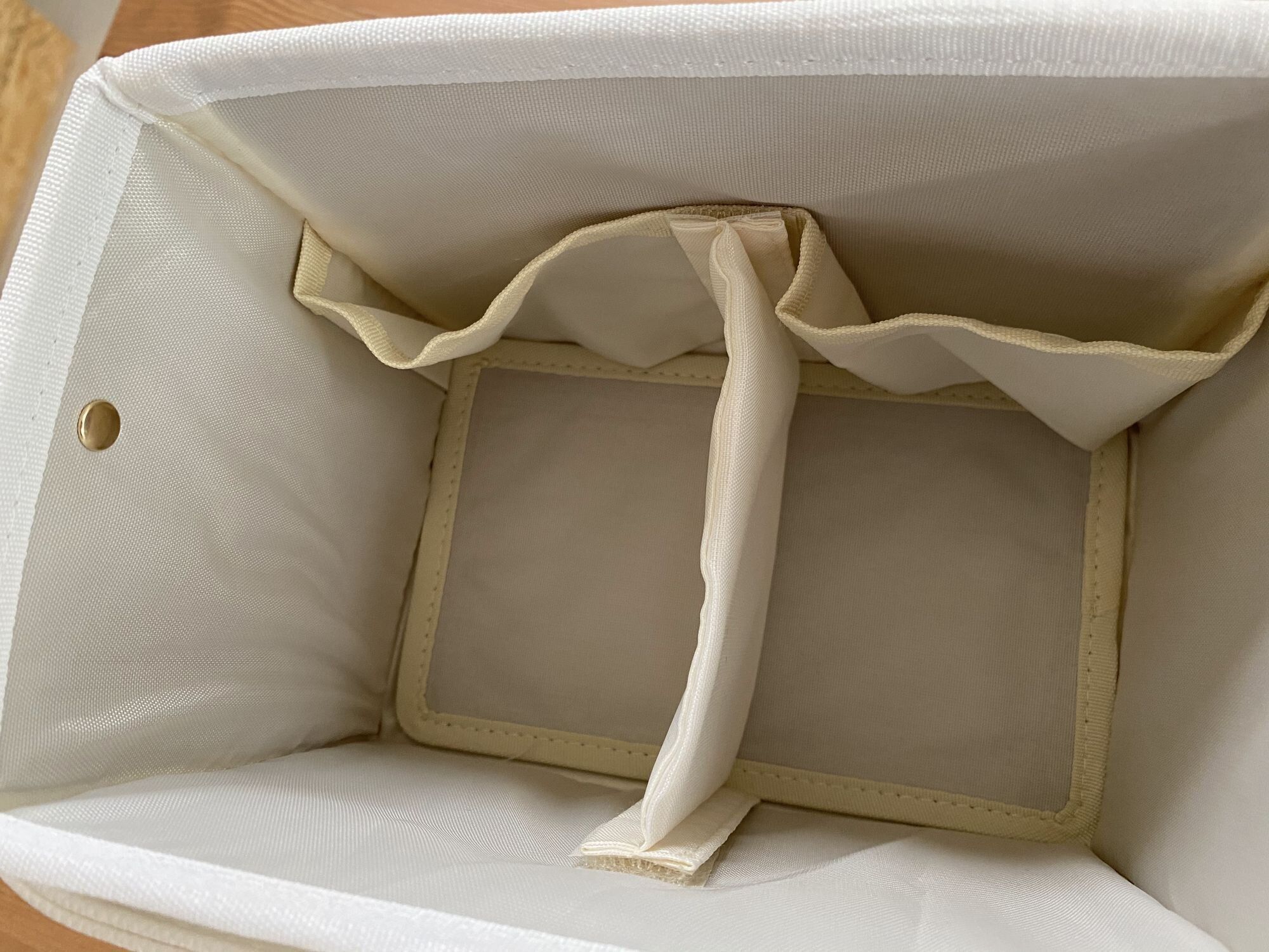 また、中央にはマジックテープで着脱可能な仕切りがつけられます。仕切りをつければ、スキンケアとメイクグッズに分けたり、大きさによって収納したりといったこともできます。内ポケットが2つあるので、リップやマニキュアはここに入れるのもおすすめです。