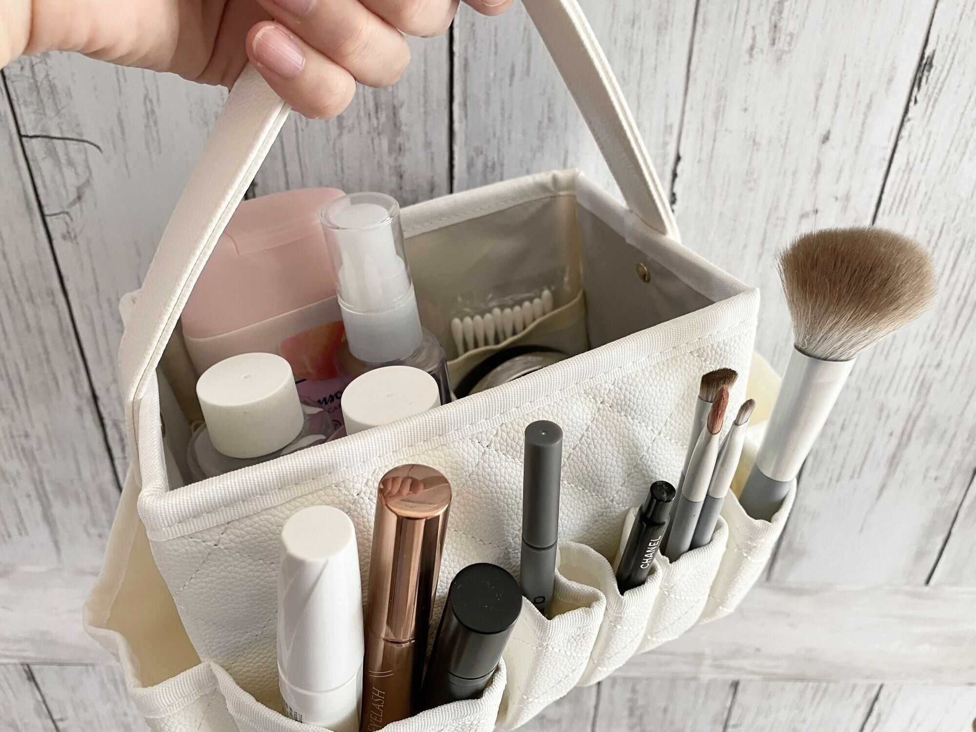 小さめのマニキュアボトルはサイドのポケットへ。写真はマスカラやスティック状のグロス、コスメブラシなど入れてみたものなので、サイズ感参考にしてくださいね。