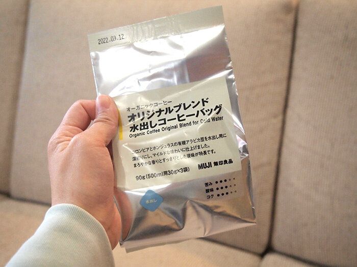 昨年からかなり愛飲しております、無印良品の「オーガニックコーヒー オリジナルブレンド 水出しコーヒーバッグ」。500mlの水出しコーヒーが3回分作れて490円!500mlだと5杯くらいは飲めるかな?冷蔵庫で冷やしたまんまでいいので、かなりリピートしています。