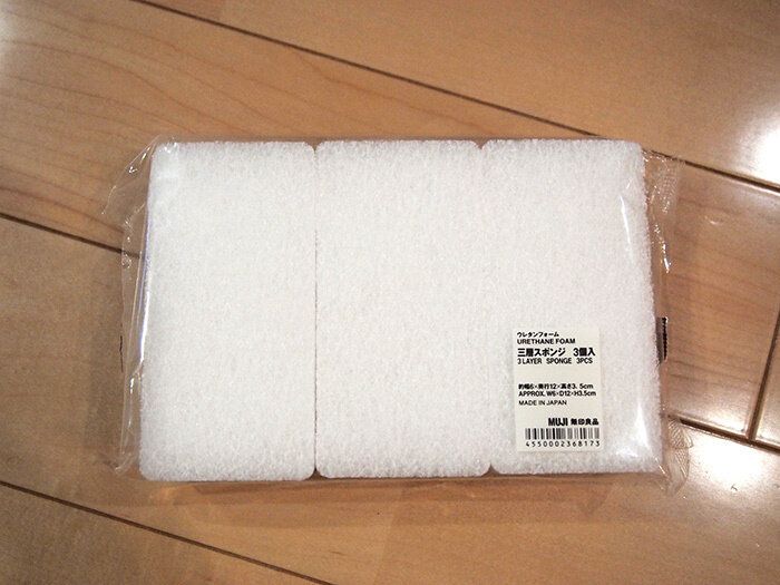 ど定番ですが「ウレタンフォーム三層スポンジ」は3個で299円。1つ100円もしないのだけど、これはわが家では何度リピ買いしたことやら…。