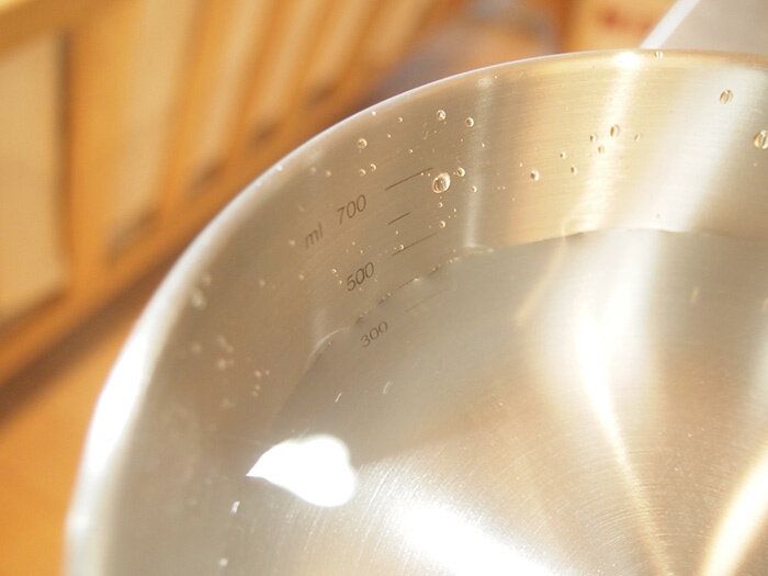 ステンレスのボールです。ml単位の目盛りがついており、簡単な軽量にも使えます。お値段は490円。少なめの和え物などを使うときに便利ですよ。たかがボール、されどボール、ステンレスのしっかりした製品でこの価格というのが魅力です。