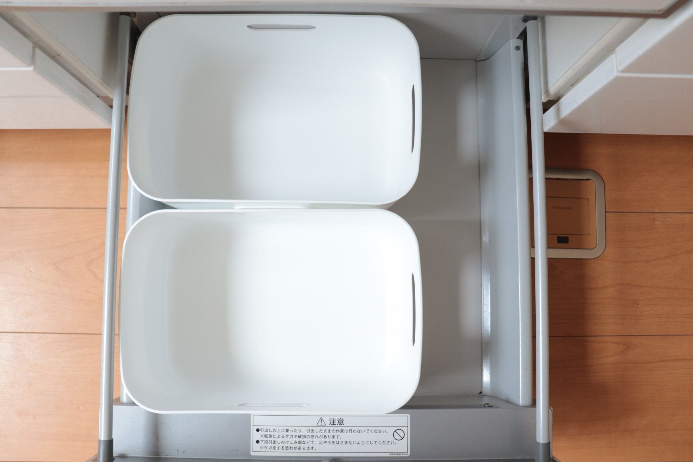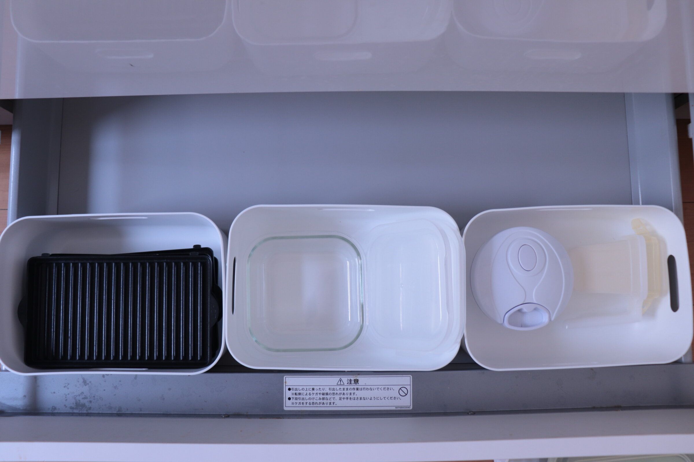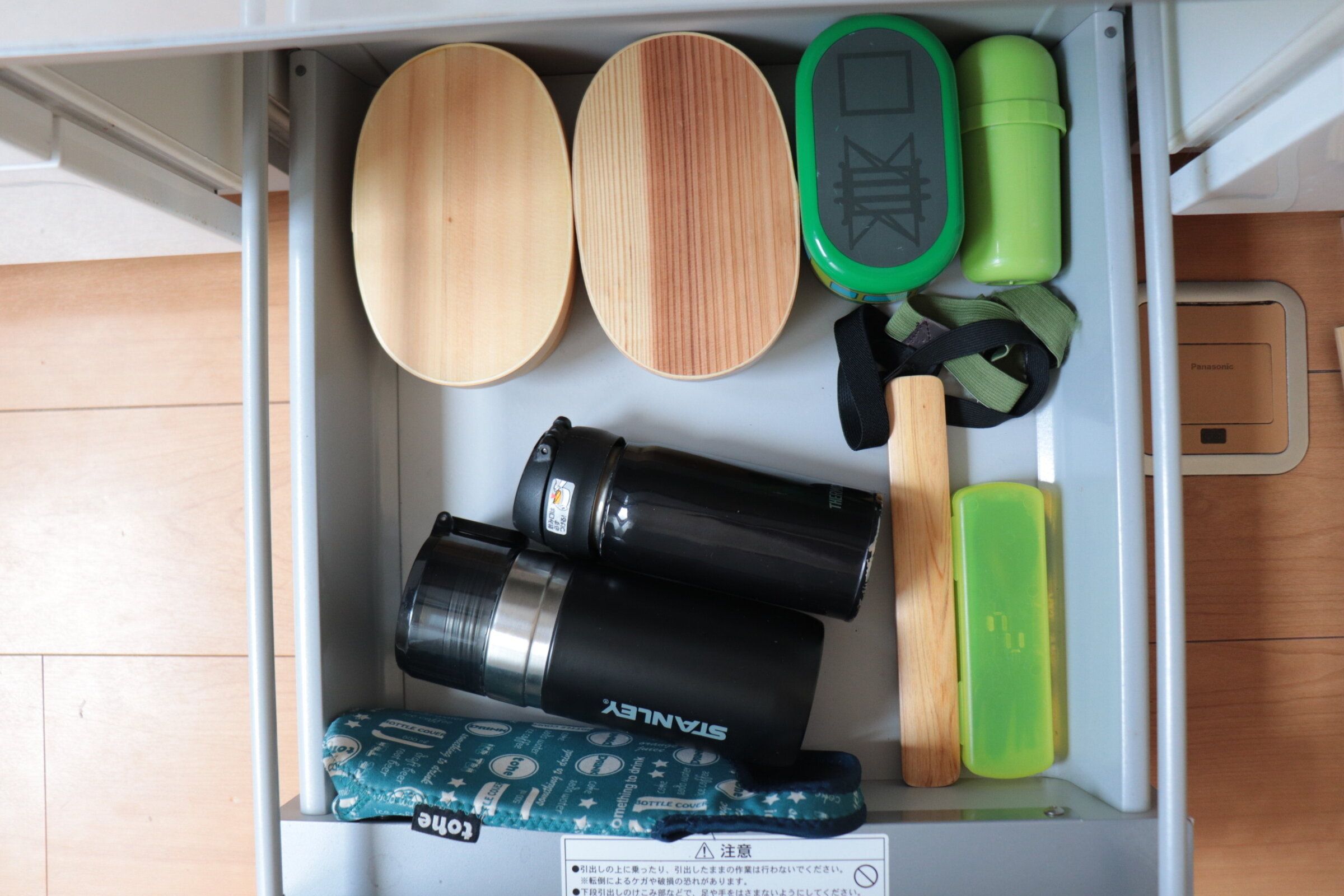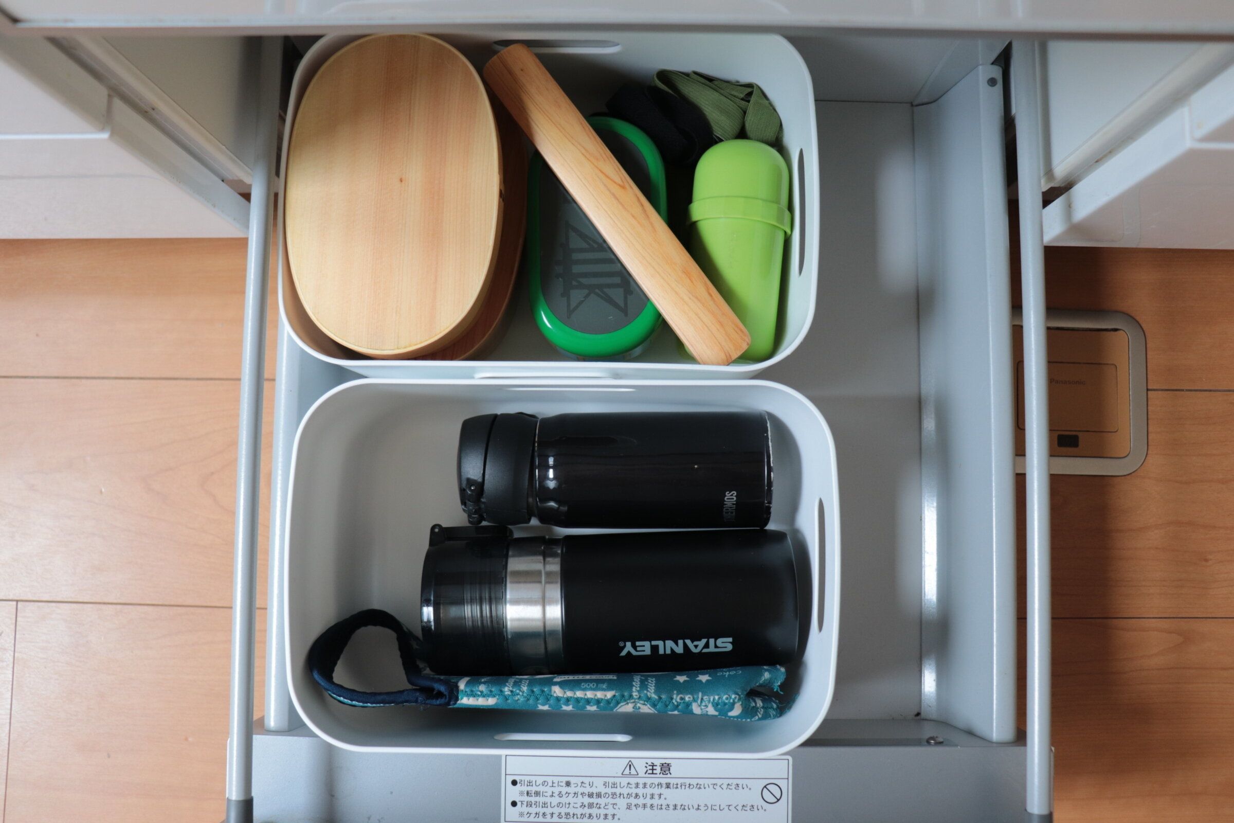 お弁当箱や水筒などこまめに使うけどしまっておきたいものを我が家はキッチンのいちばん下の引き出しに収納しています。