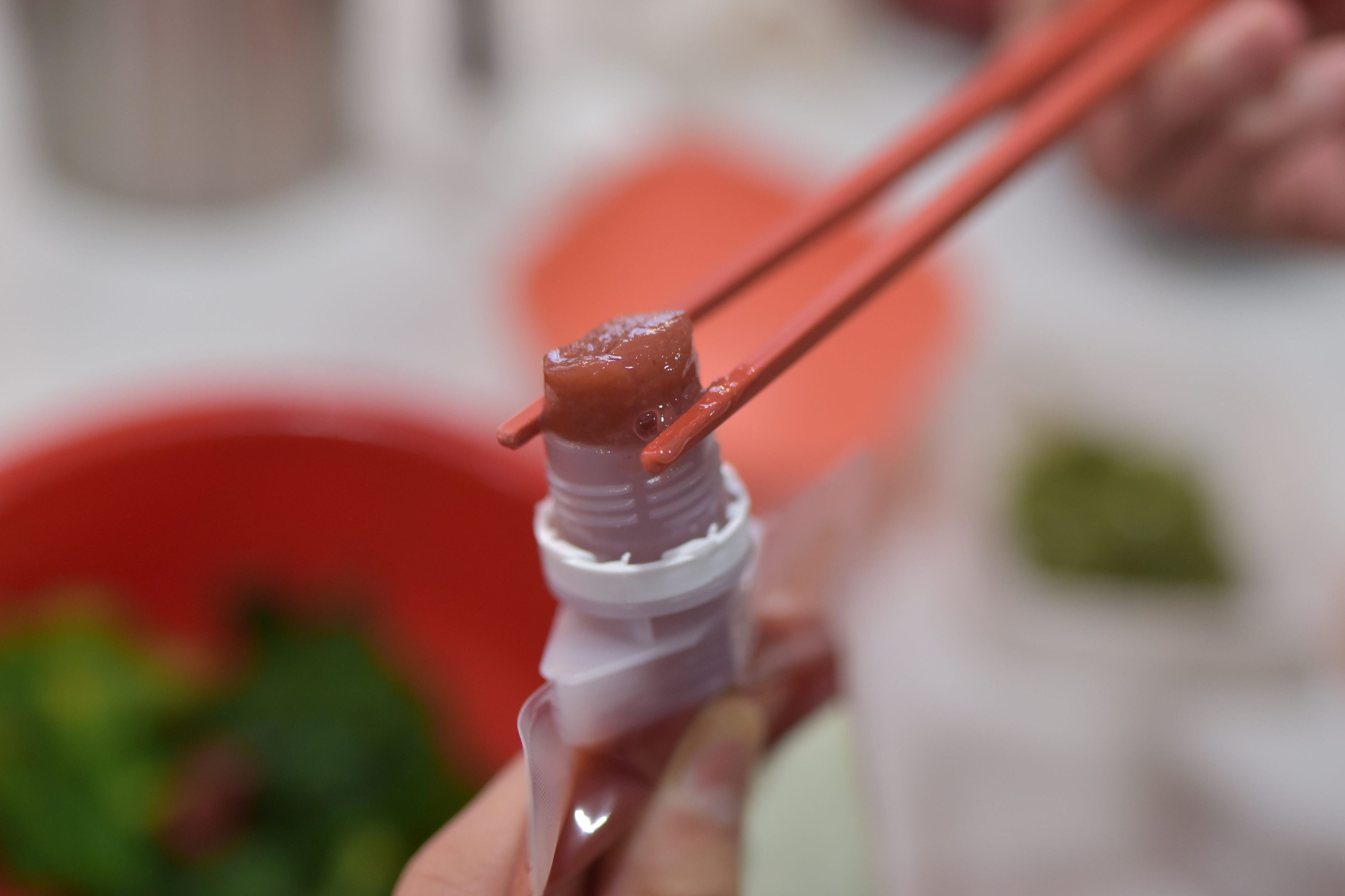しぼりやすいふと口のチューブで、果肉がやわらかいので、出しすぎを防ぐためにも上向きでしぼりだし、清潔な箸などでつまみ取るようにすると必要量をむだなく使用できます。