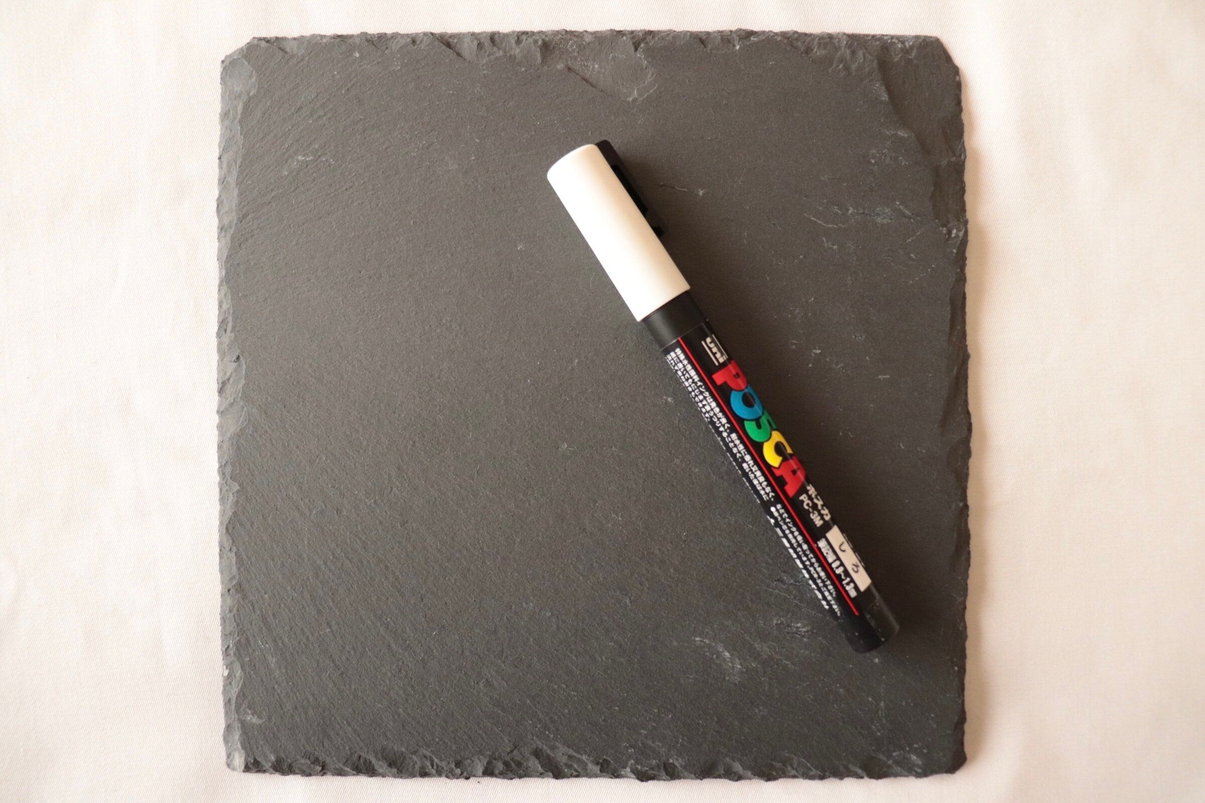 スレート皿はポスカやチョークで書くことができるんですす!ニトリの「スレートプレートS」(税込407円)は20×20cmというサイズ感。今回はここに文字を書いて、「ここ最近は必ずどこにでもあるもの」を乗せていきますよ!