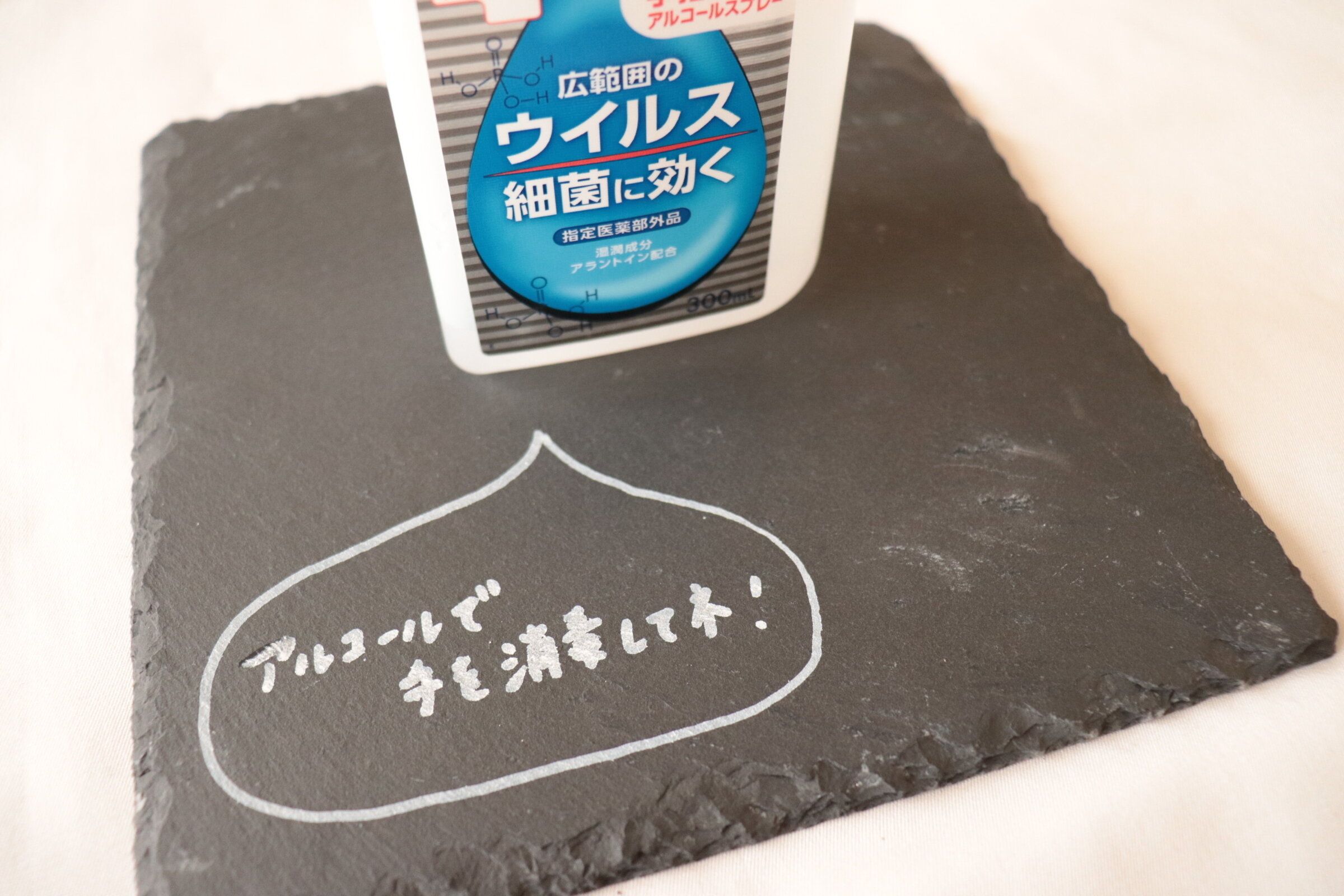 乗せたものはアルコールスプレー。ちょっとしたメッセージがうれしいポイント!スレートの台に置いたことによってアルコールスプレーさえもなんだかちょっとおしゃれに見える?