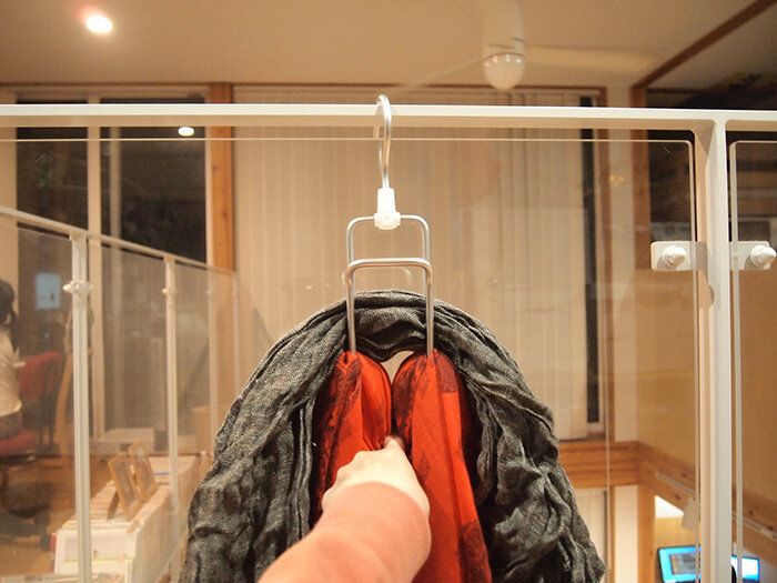 重ねてあるスカーフも、上下・手前・左右に引き出せるようになっています。下に重なっているスカーフは、写真のように指で引っ張ってあげるとスっと出てきてくれます。これは便利!色々と重ねてしまう習性のある人には大変おすすめ。