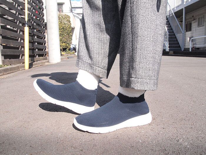 長靴を履く場合にはものすごくタイトなスキニーか、もしくはワイドパンツで全体を覆うか、というぐらいしか選択肢がなく、微妙な太さのパンツが履けずに長靴の出番はおろそかになる一方……しかし!「かかとの衝撃を吸収するスリッポンスニーカー」は、ハイカットとローカットがあり、どちらでもふだんのパンツに合わせることができます。便利!