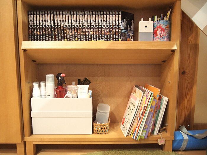 上部の方は持ち手がついているので、奥のものを取り出したいときにも簡単に引っ張り出すことができて省スペースです。毎日必要な体温計などもアワアワ探さなくてもすぐ見つかるので本当にこの仕組みにしてよかったです!さまざまな種類の収納用品があるので、何か計画する際には必ず棚の大きさなどを計測して持ち歩くのがよいと思います!